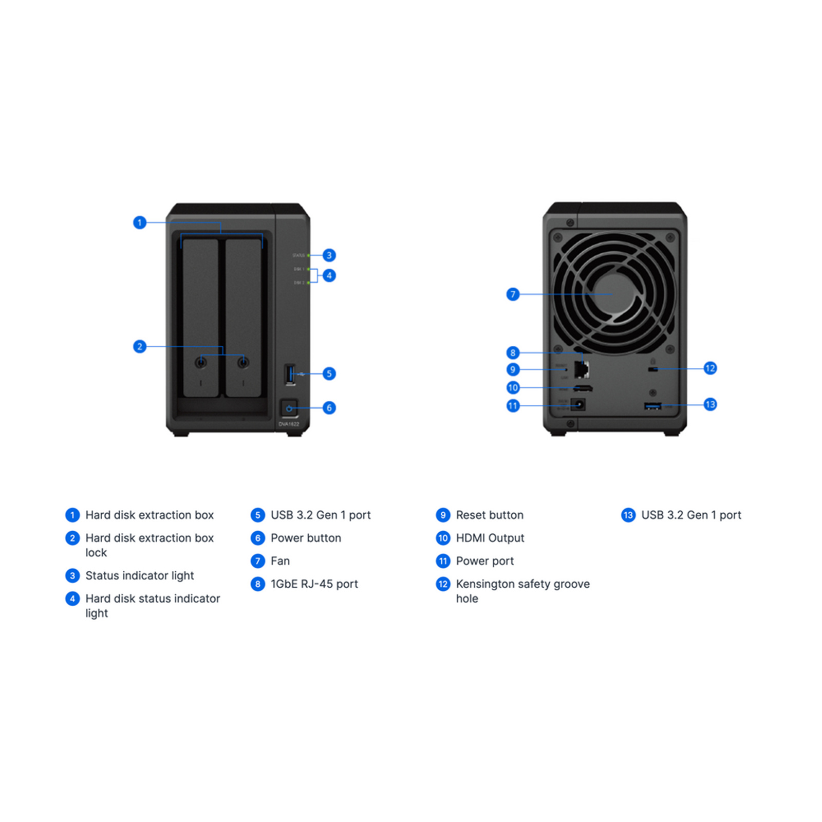 Synology DVA1622 AI-powered Video Surveillance 2-Bay NAS Intel Quad Core Up to 2.7 GHz - Intel UHD Graphics 600 - 6GB DDR4 - 1x GbE - 2x USB 3.2 - 8 Camera License Included (16 Licenses Max)