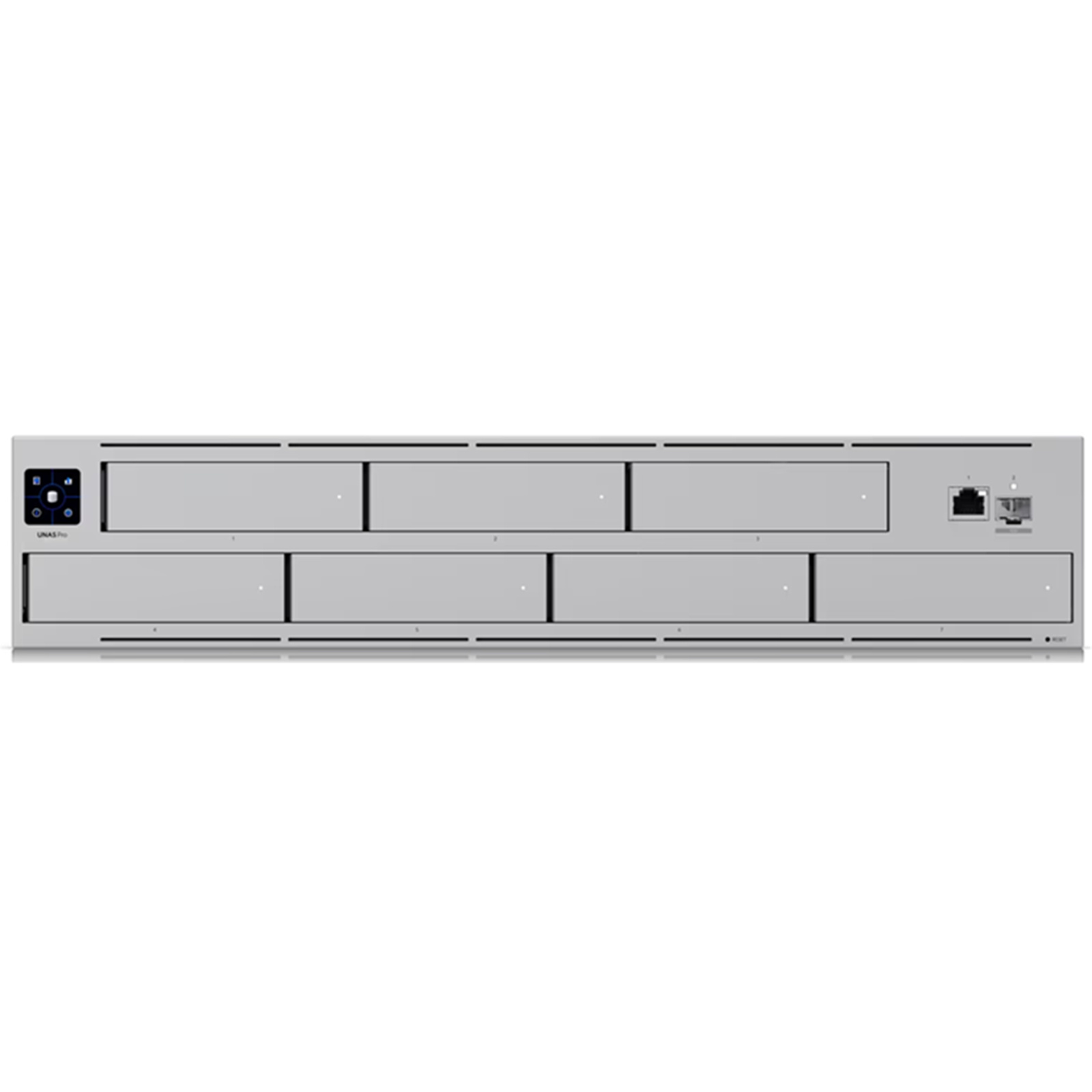 Ubiquiti UniFi UNAS-Pro is a 2U rack-mount NAS with (7) 2.5/3.5" drive bays and 10 Gbps performance designed for large-scale file storage and sharing.
