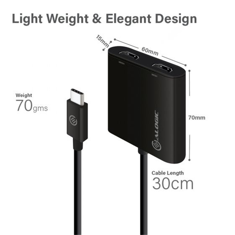 The Alogic USB-C to Dual HDMI 2.0 Adapter lets you to connect two 4K displays - 30Hz independently to a computer enabled with USB-C output.