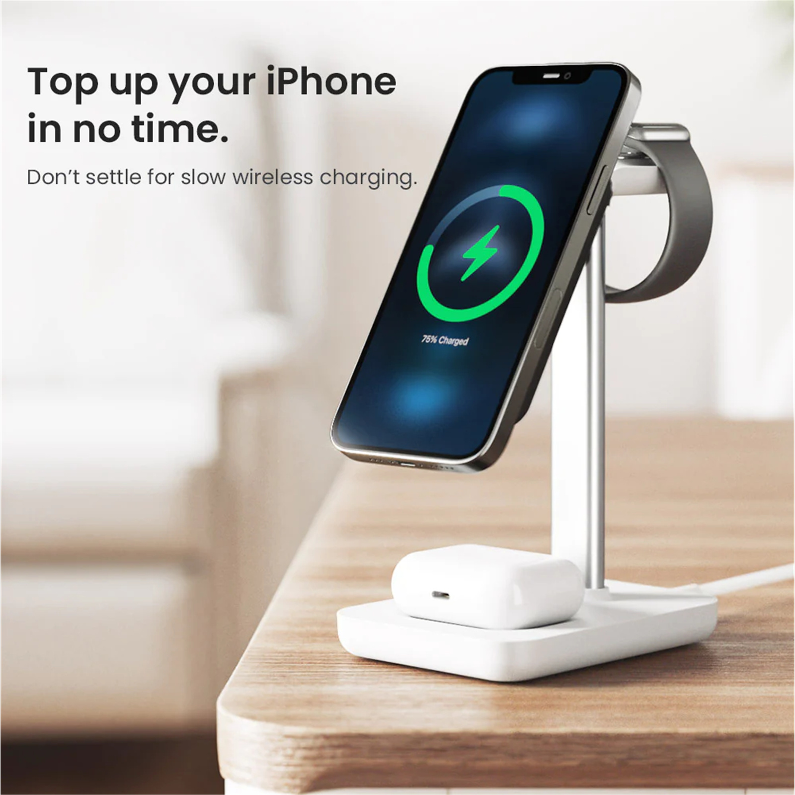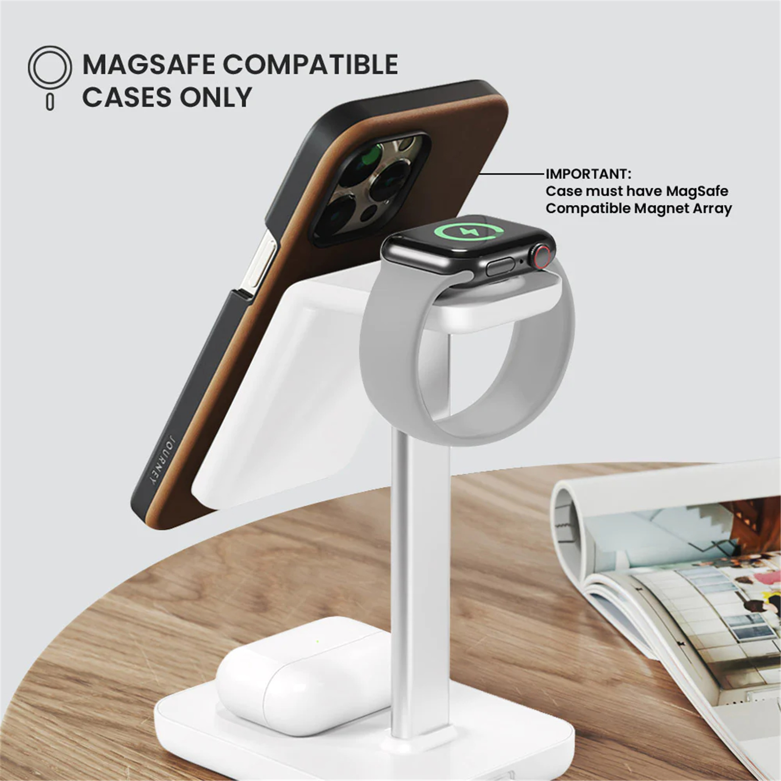 The Journey MagSafe Compatible 3-in-1 Wireless Charging Stand with Wall Charger has an integrated MagSafe compatible magnetic ring which supports MagSafe wireless charging for wireless battery top-up. Plus, its open bottom and dedicated spaces secure each of your device for uncompromised functionality.
