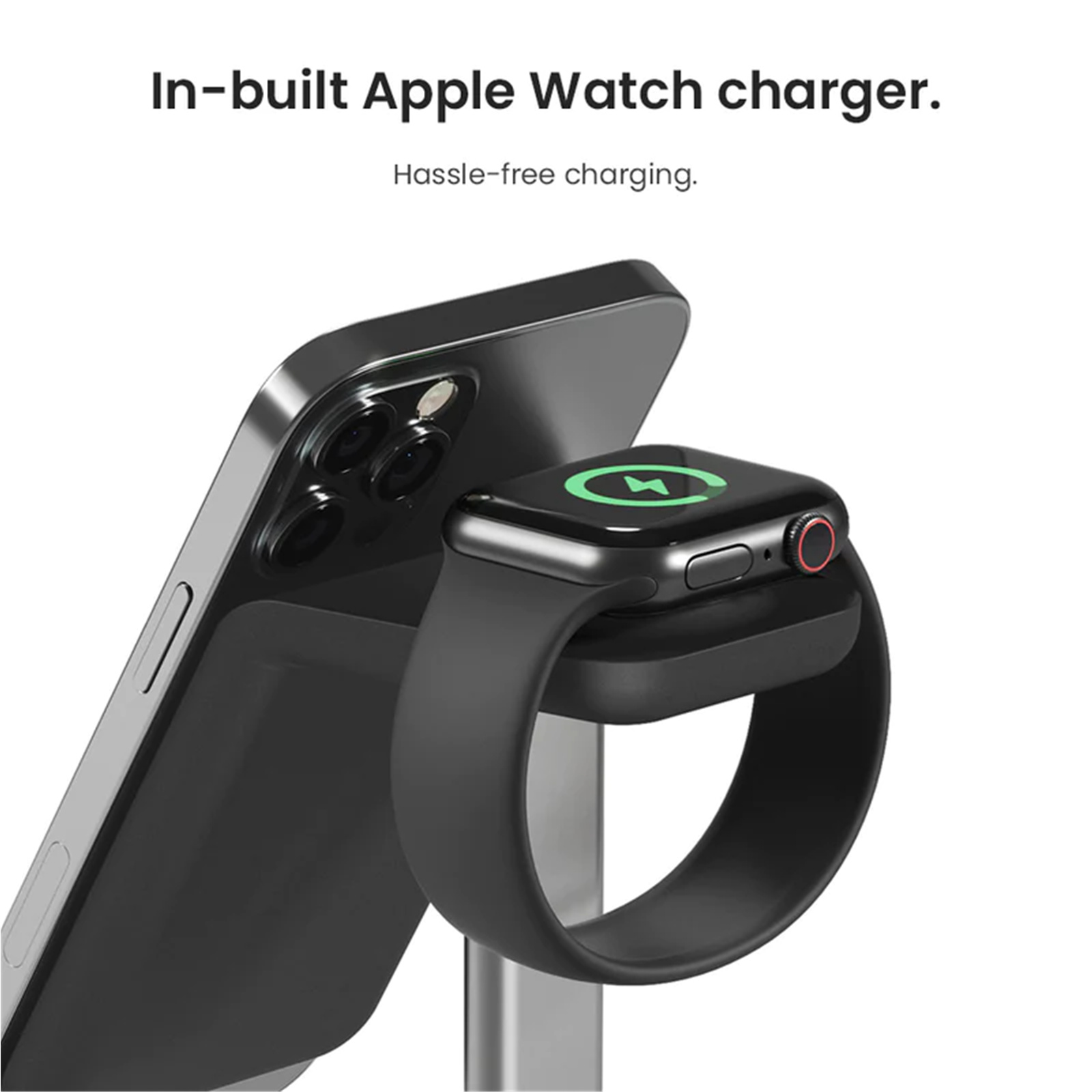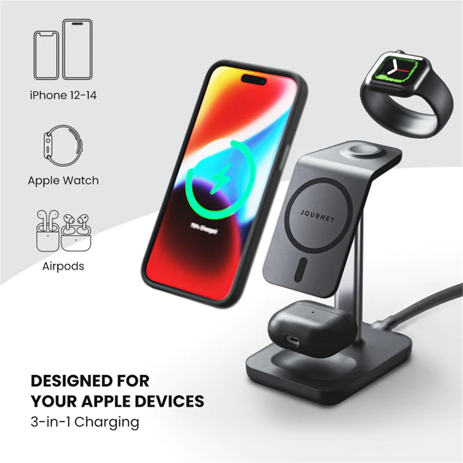 The Journey MagSafe Compatible 3-in-1 Wireless Charging Stand with Wall Charger has an integrated MagSafe compatible magnetic ring which supports MagSafe wireless charging for wireless battery top-up. Plus, its open bottom and dedicated spaces secure each of your device for uncompromised functionality.