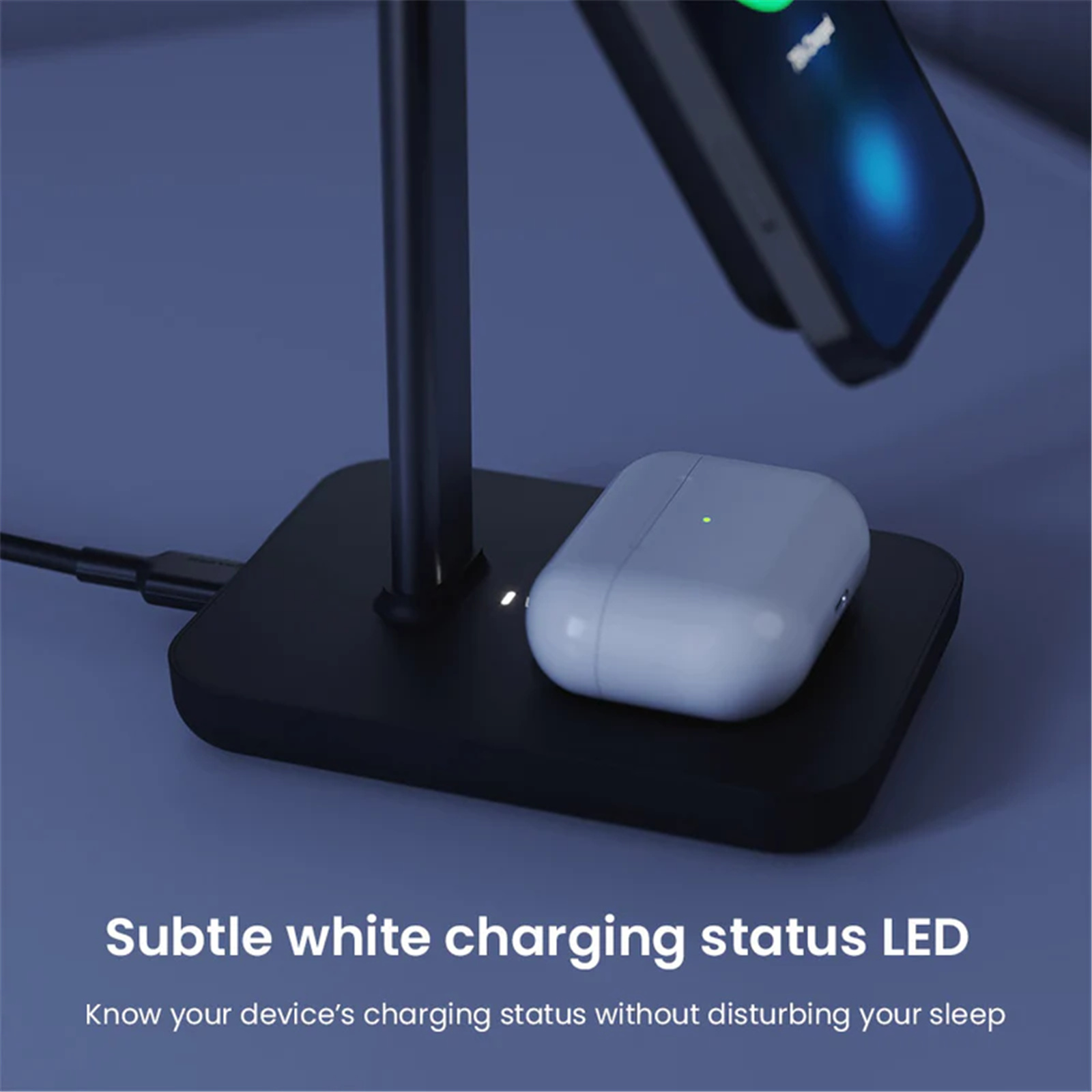 The Journey MagSafe Compatible 3-in-1 Wireless Charging Stand with Wall Charger makes it a breeze for you to bring your smart watch, smartphone, and wireless earpods (each sold separately) to a full charge all at the same time.
