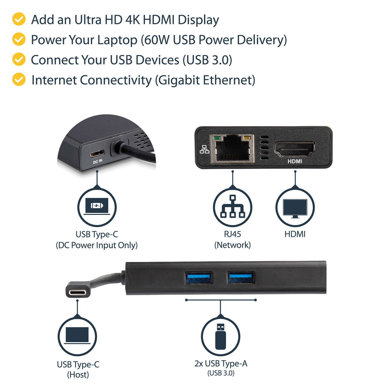 60W Power Delivery Pass-Through - GbE - 2pt USB-A 3.0 Hub - Portable Mini USB Type-C Dock for Laptop