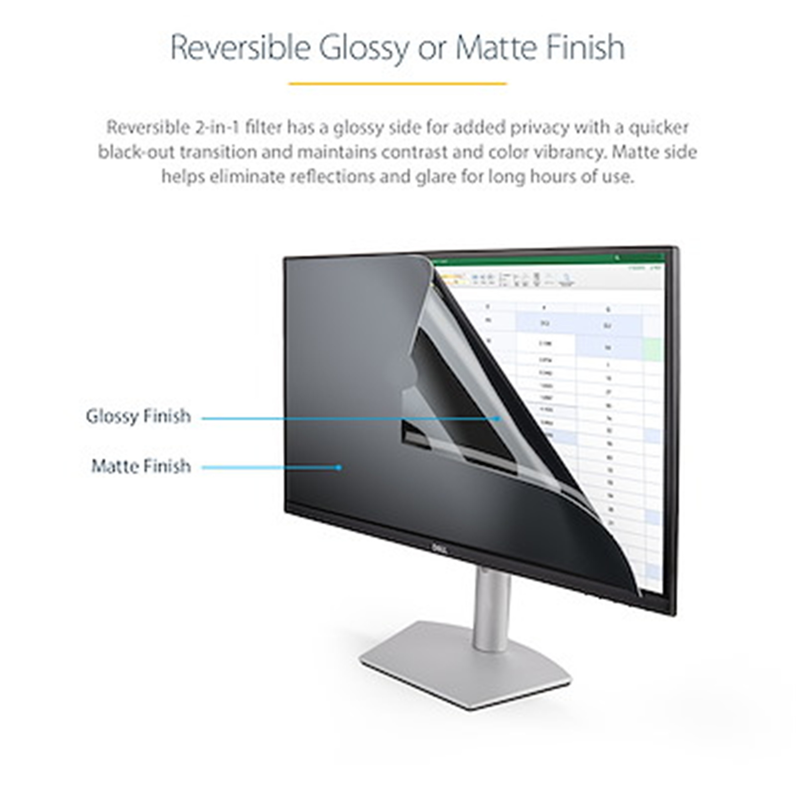 - REDUCE GLARE OR INCREASE CLARITY: Reversible computer monitor privacy filter retains sharp and consistent image quality in any lighting with an anti-glare matte-finish or a high-clarity glossy-finish