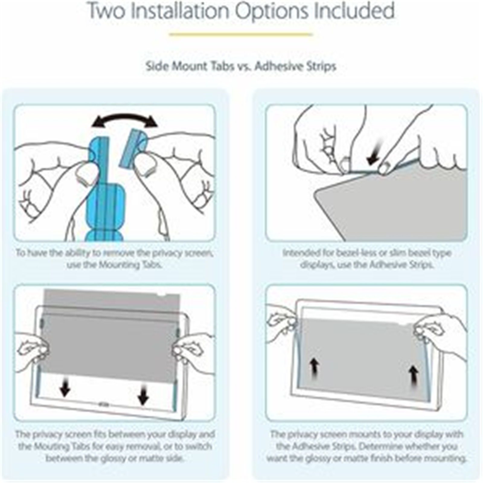 The monitor privacy screen is easy to attach and remove. Simply attach the 23 inch privacy screen to your 16:9 aspect ratio display using the attachment strips or slide-mount tabs. This confidentiality screen filter is also reversible. The matte side provides you with glare reduction and the glossy side of the privacy screen will provide you with increased clarity.