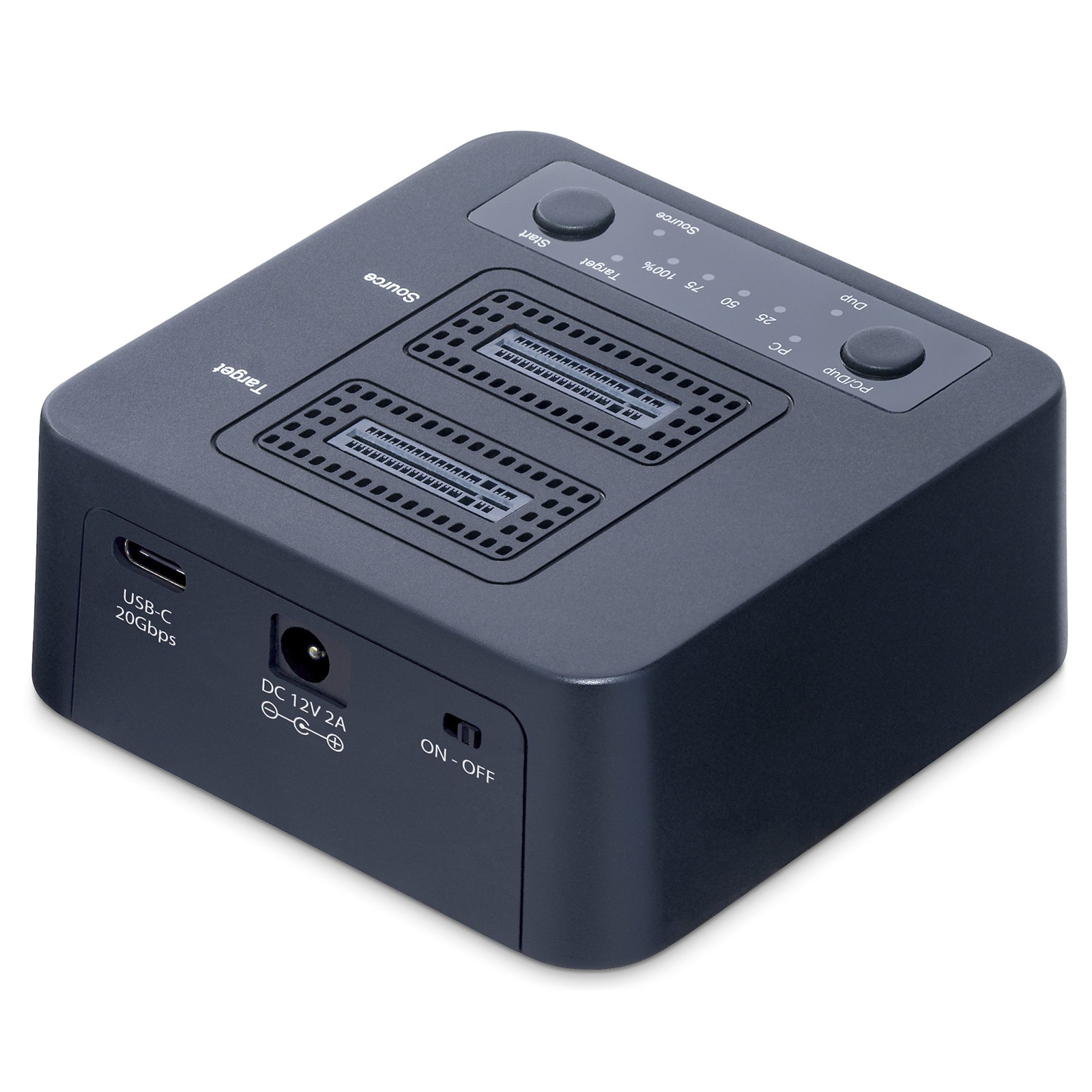 This M.2 NVMe drive duplicator with a USB 3.2 Gen2x2 (20Gbps) host port offers high-speed duplication capabilities of up to 90GB per minute, providing efficient and fast cloning of storage devices.