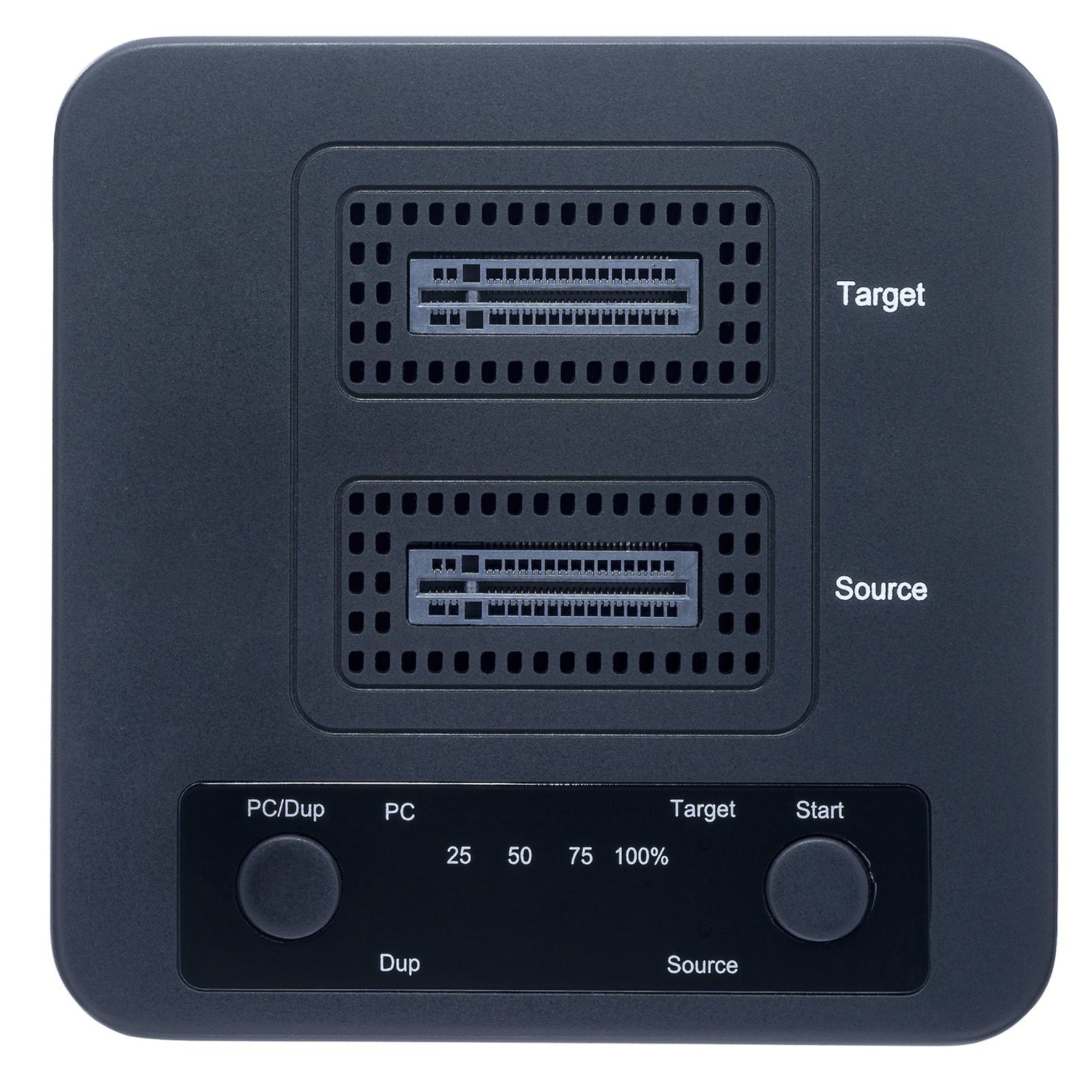 The top-loading (toaster-style) design accommodates all PCIe M.2 (M-Key) drives, including those with pre-installed heat sinks. The device supports 4Kn sector size. Please note that the target disk must be equal to or larger than the source disk.