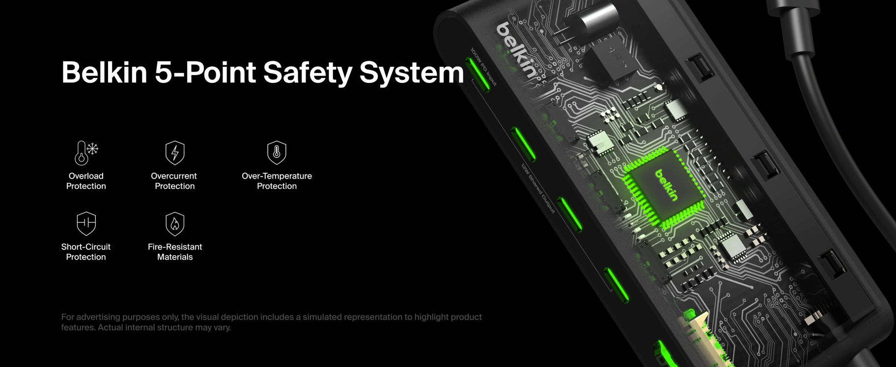 - Get peace of mind with a 5-point safety system featuring protections from overload, over-current, over-temperature and short circuit, and constructed of fire-resistant materials
