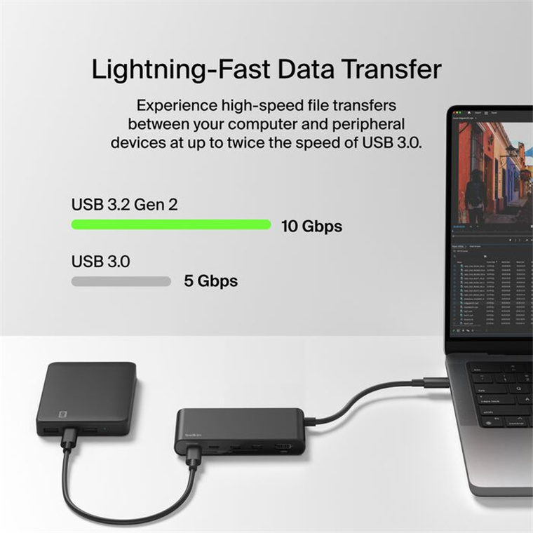 Content creators and productive professionals can expand the USB-C ports on their laptops to connect up to five peripherals including hi-res monitors, hard drives and webcams. HDMI supports up to 4K @ 60Hz displays, transfer speeds are 2x faster than USB 3.0 and 100W Power Delivery to host device makes this the ideal hub for home, in the office or on the go.