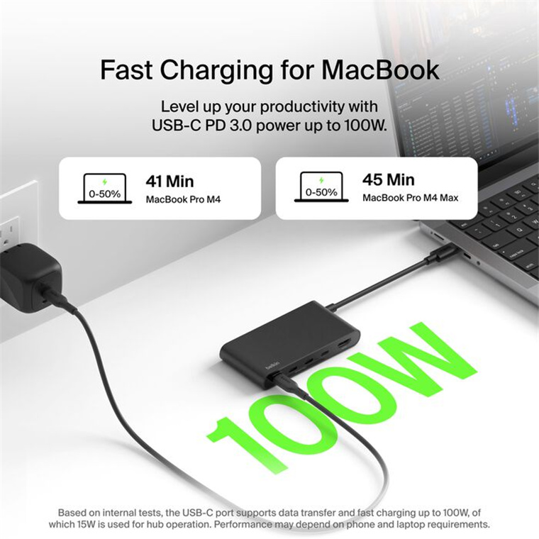 [1]USB-C port supports data transfer and pass-through charging up to 100W, minus 15W for the hub's operation. Recommend using 60W charger (not included), which will deliver up to 45W pass-through charge while using other hub functions. Performance depends on laptop requirements.