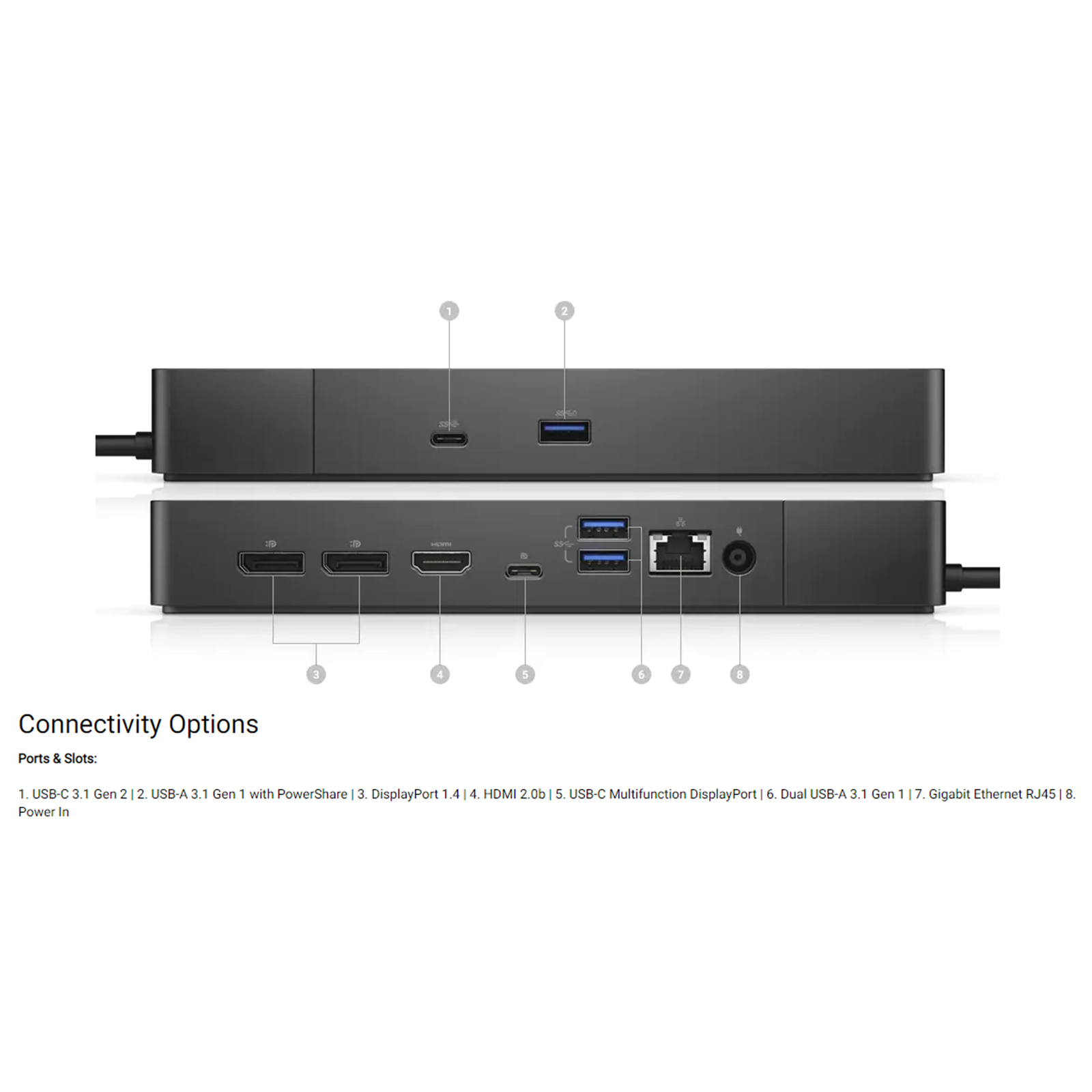 1. USB-C 3.1 Gen 2 | 2. USB-A 3.1 Gen 1 with PowerShare | 3. DisplayPort 1.4 | 4. HDMI 2.0b | 5. USB-C Multifunction DisplayPort | 6. Dual USB-A 3.1 Gen 1 | 7. Gigabit Ethernet RJ45 | 8. Power In