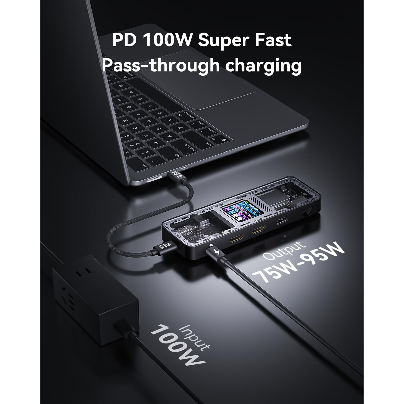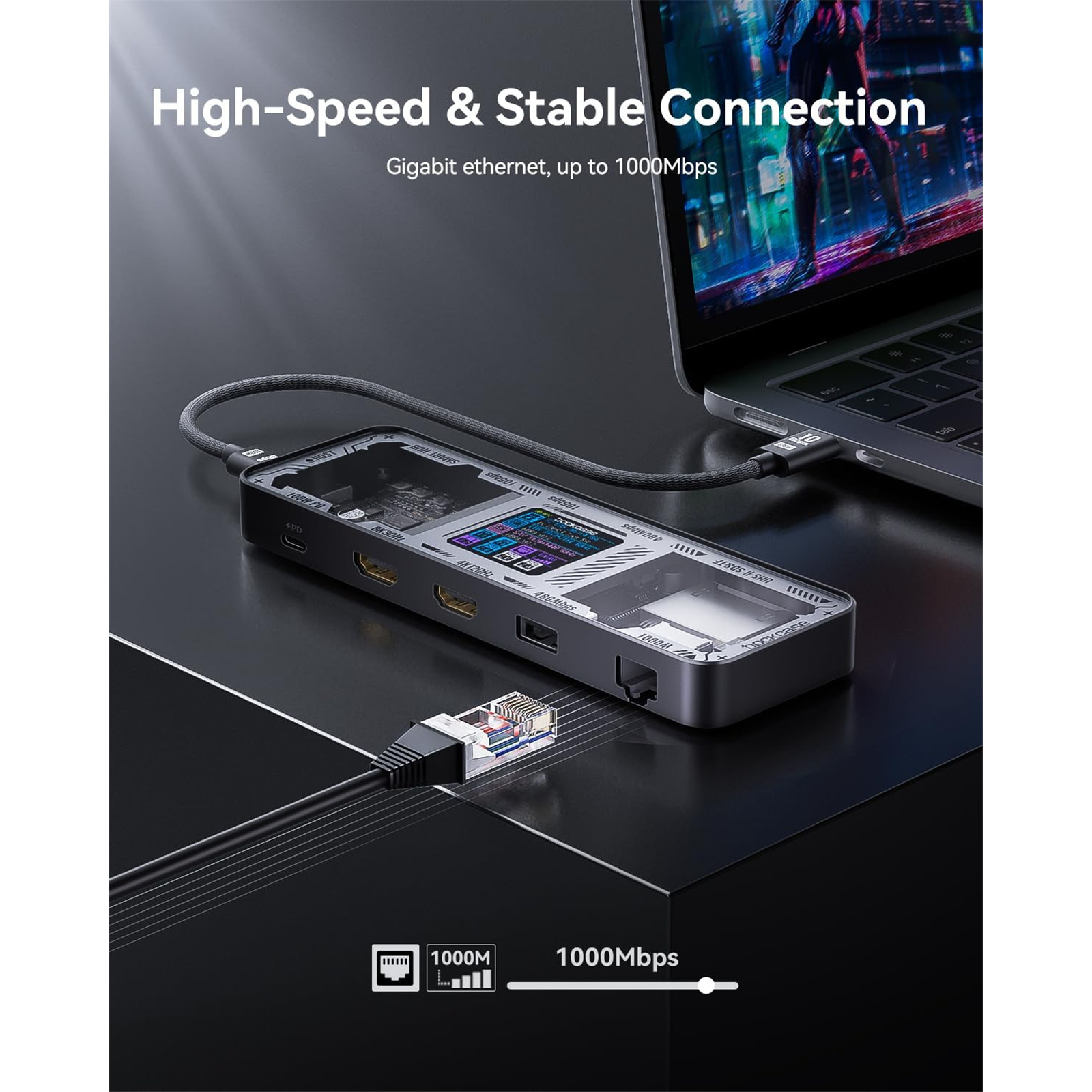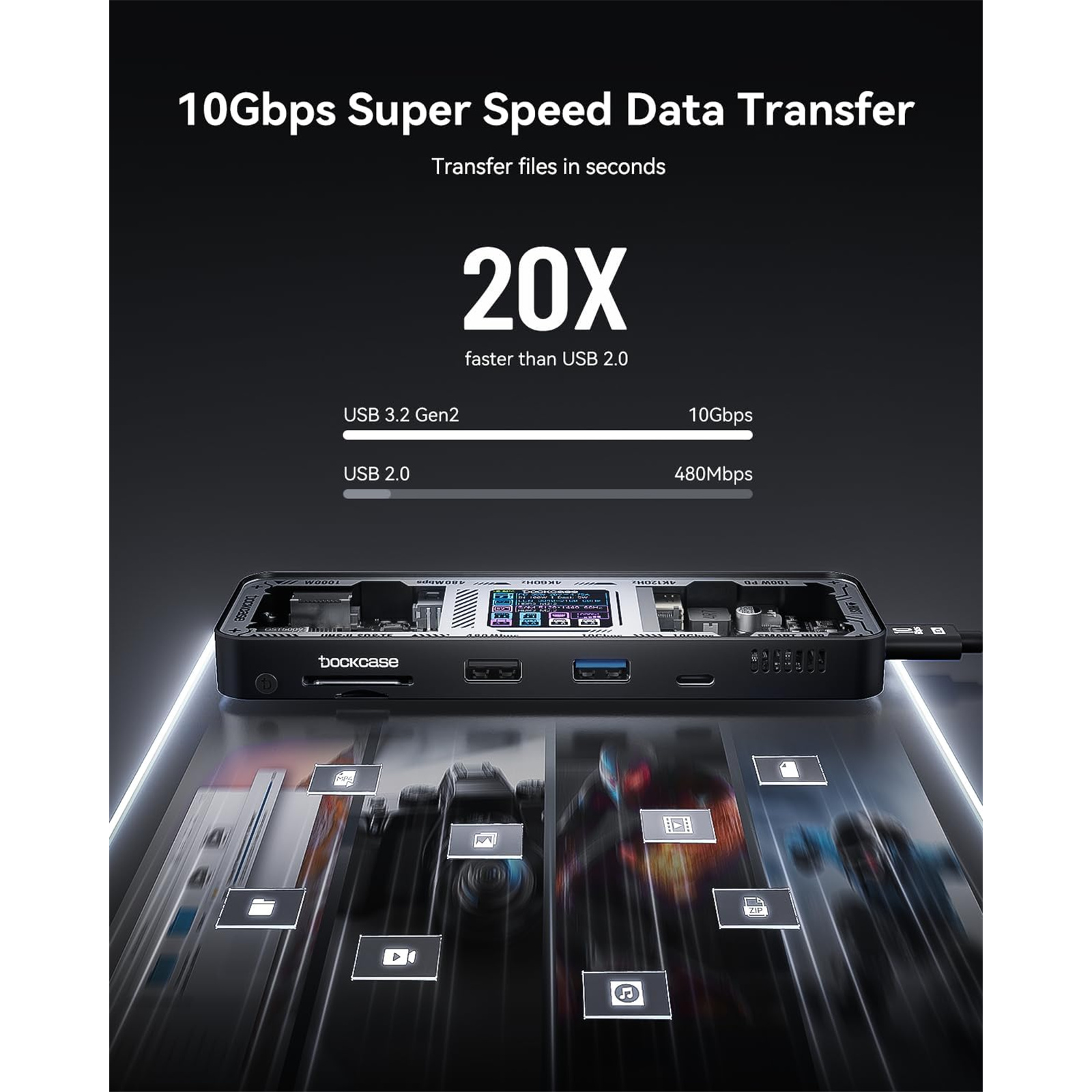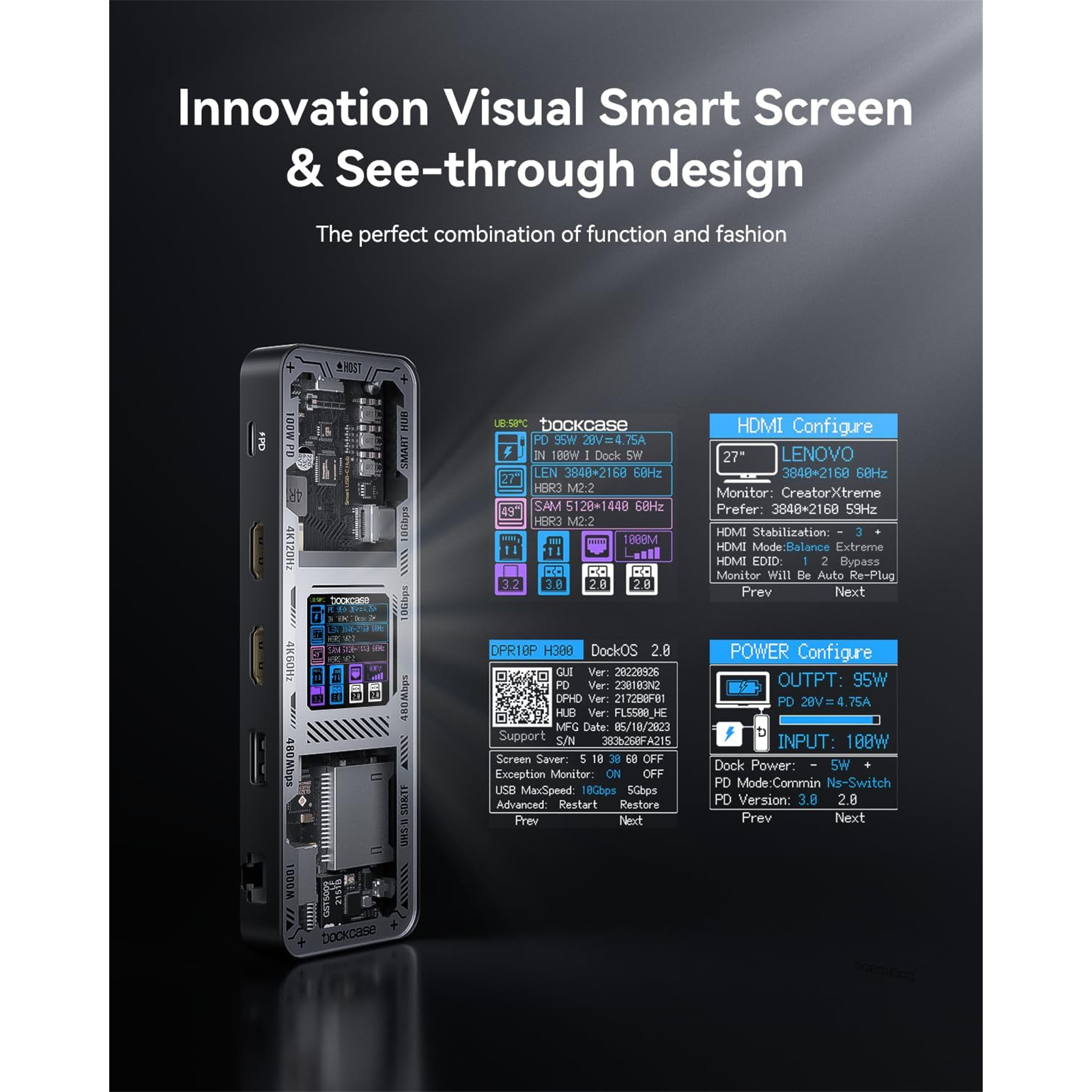 Dockcase Explorer Edition - Matte Black 10in1 10Gbps USB-C Dual 4K Smart Hub with 100w Power Delivery 1.54" Screen - HDMI2.1a (8K30Hz/4K120Hz) x1 - HDMI2.1 (8K30Hz/4K120Hz) x1 - USB-C x1 - USB-A x3 - Gigabit Ethernet x1 - SD&TF Card Slot x1