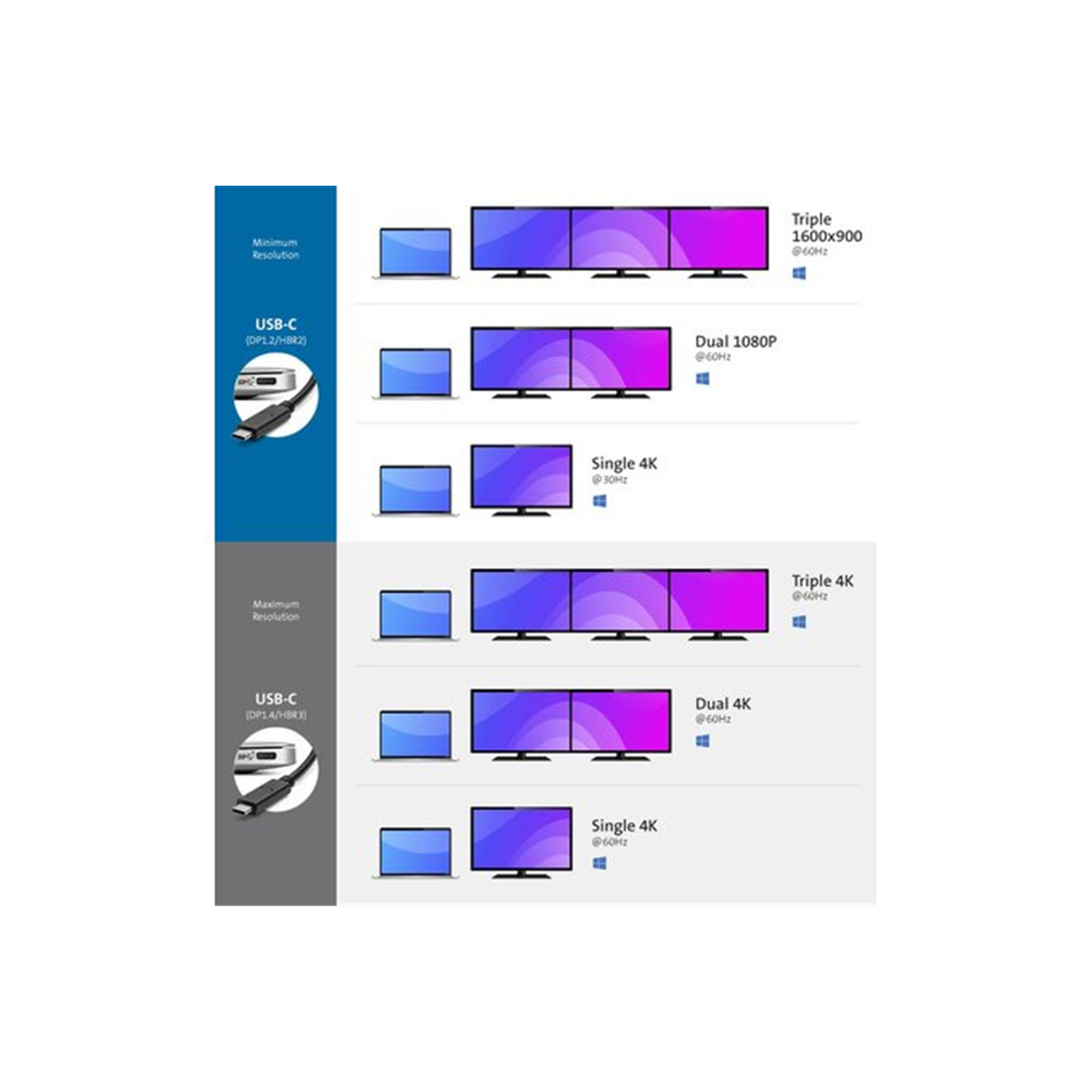 Minimum Resolution (DP1.2/HBR2): Single 4K @ 30Hz Dual 1080p @ 60Hz Triple 1600x900 @ 60Hz ,Maximum Resolution (DP1.4/HBR3): Single 4K @ 60Hz Dual 4K @ 60Hz Triple 4K @ 60Hz