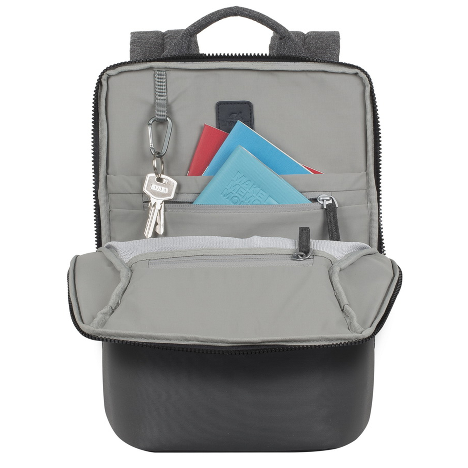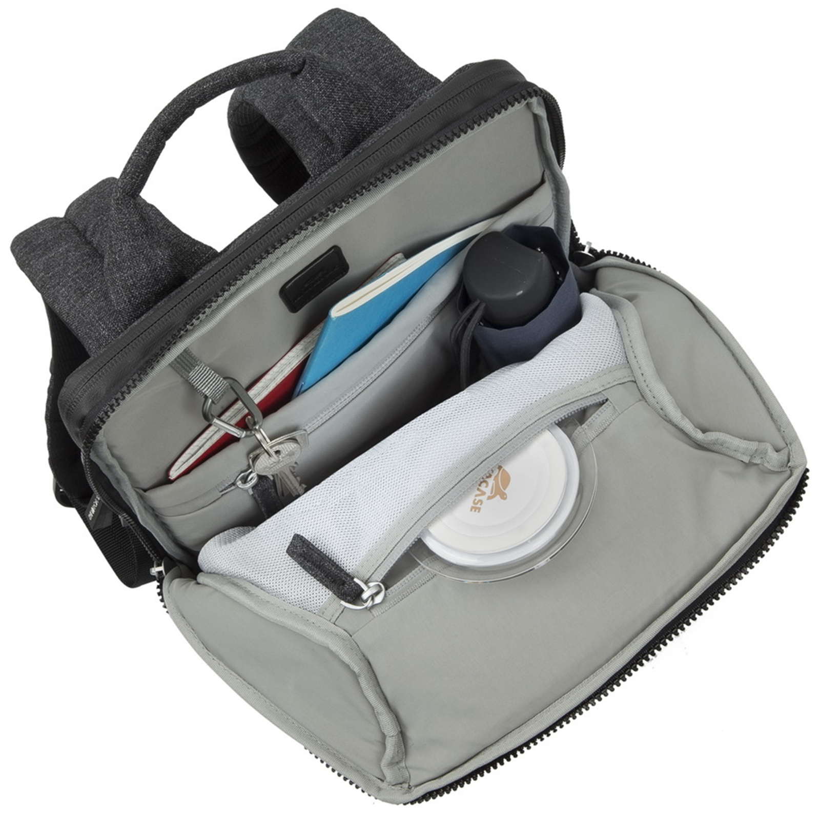 - Zippered compartment with a pocket for documents, two zippered pockets and a pocket for a bottle or an umbrella.