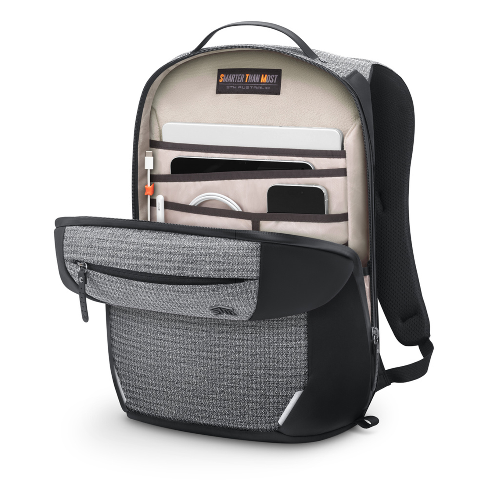 The STM Myth Backpack 18L features our proprietary SlingTech that has extra padding and gapless corners to suspend your MacBook away from the edge of the pack, isolating it from the bump zone. Its remarkable CableReady system lets you charge on-the-go with cables out of sight. We also designed our air channel back-panel-and-yoke system to wrap around you and provide improved weight distribution. This amazing backpack will please the right brain with its fashion-forward looks, while satisfying the left brain with an array of groundbreaking features.