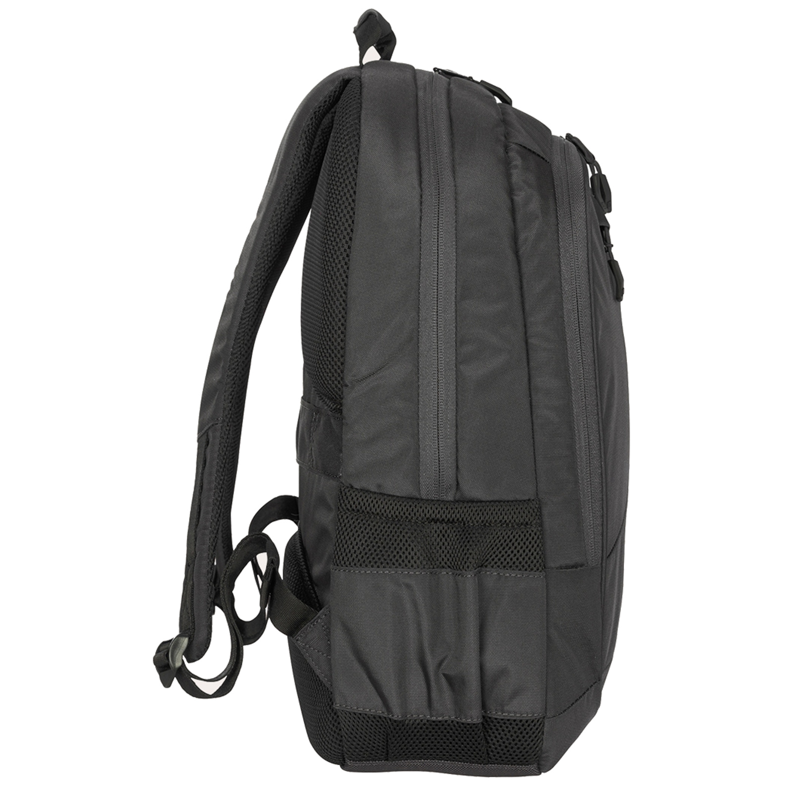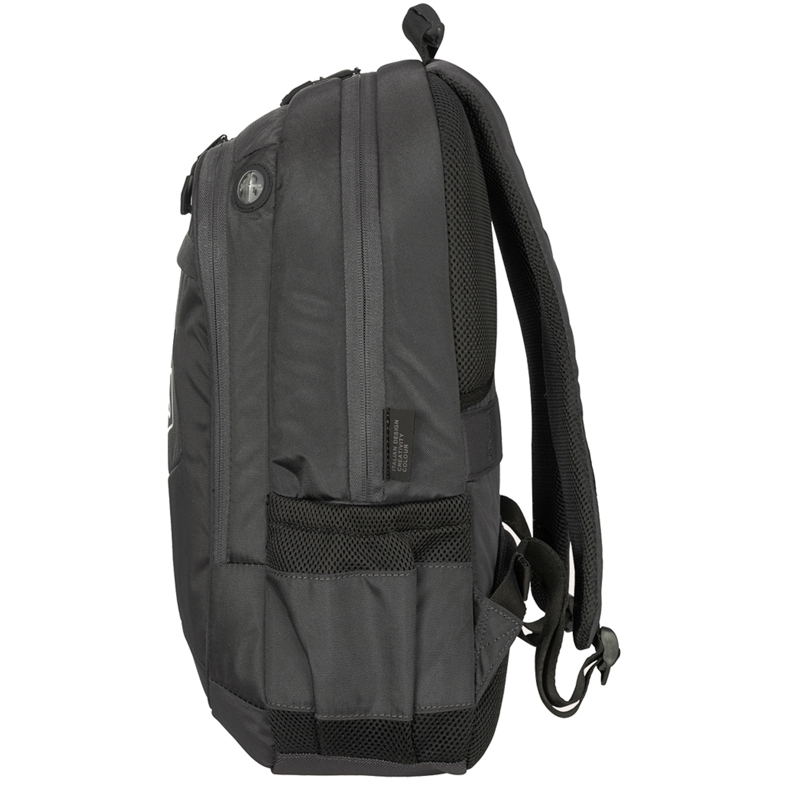 Backpack with unique style suitable for the professional or student heading back to school, made of fabric produced from recycled plastic. An integrated laptop compartment holds laptop 17" and also compatible with MacBook Pro 16''. Scratch resistant pocket inside is ideal for tablets including iPad2. Front pocket of the pack includes an organization panel that stores your smartphone, iPod equipped with convenient headphone hole. Side mesh pockets offer quick access to an umbrella, a snack or water bottle. Extra padding on the panel of the pack and the shoulder straps provide added cushioning. Air Mesh on the shoulder straps maintain comfort and breathability.