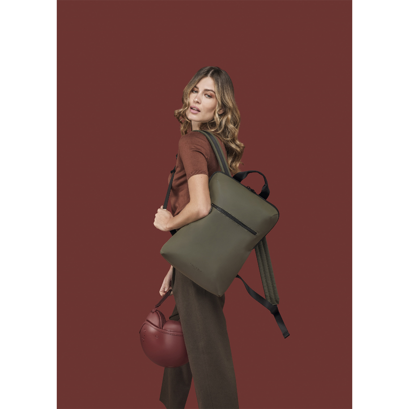 Backpack featuring a minimal-sporty design for 15.6" laptops and 16" MacBooks, in rubberized material. Equipped with a large single compartment, the Gommo backpack has an internal pocket for laptops and an external pocket for accessories. It also features a breathable mesh back as well as a convenient trolley strap.