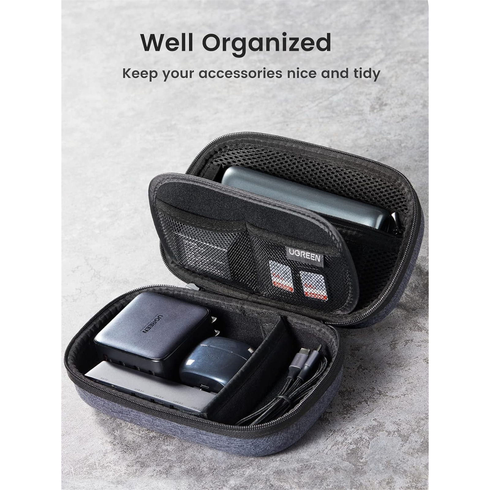 UGREEN Travel Gadget Case Bag Electronics Accessories Organiser Travel Carry Hard case Double Layer - Double zipper - Snap Hook - Carrying Strap Grey