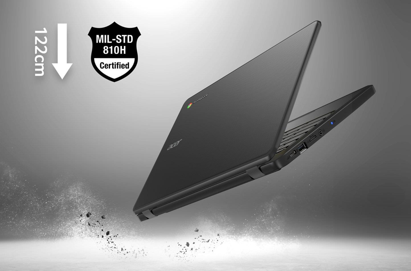 This rugged Acer Chromebook features MIL-STD-810H certification, widened brackets, a shock-absorbent bumper to protect from drops as high as 122cm, and a spill-resistant keyboard that protects components from up to 330ml of liquid.