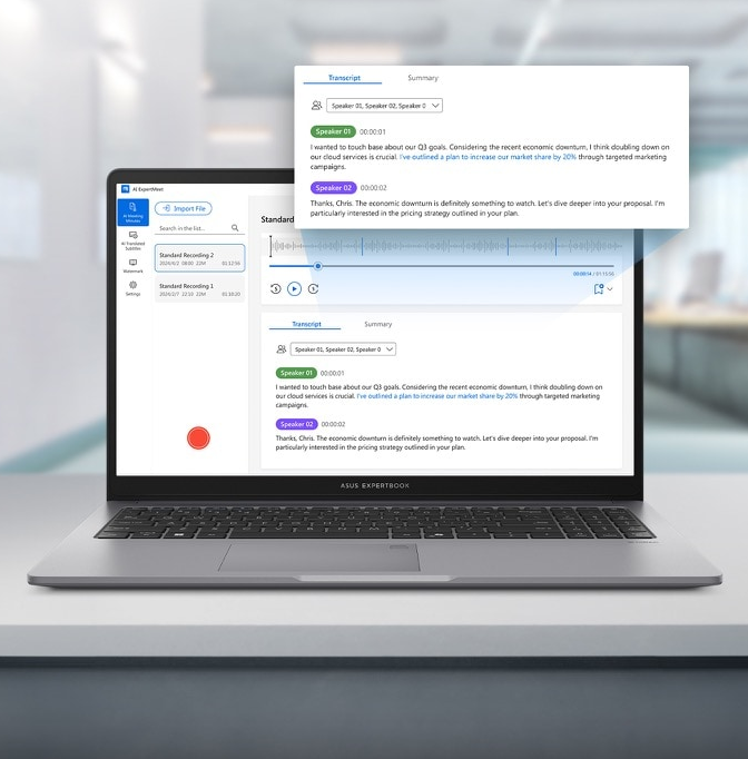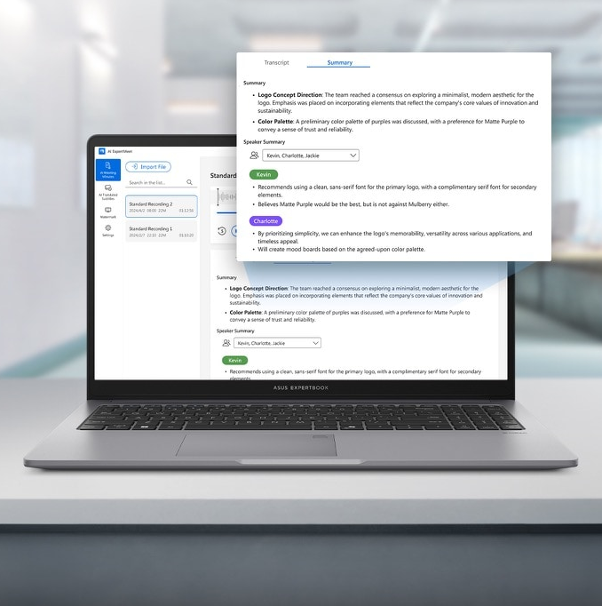 ASUS AI ExpertMeet2 is designed to bring you and your business partners closer by eliminating barriers to international conference calls. It offers seamless communication with AI translation and speaker ID functionality to help identify each speaker's key discussion points. In addition, the AI Meeting Minutes feature assists in extracting the key points from your meetings.