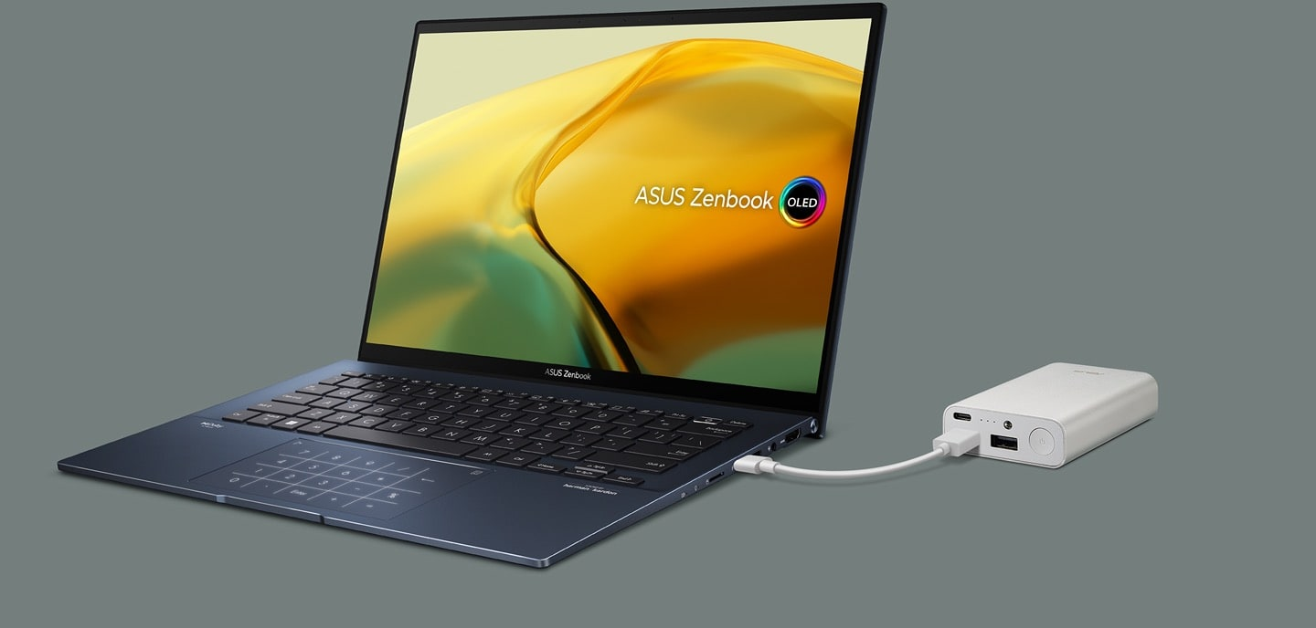 USB-C® Easy Charge support means that your Zenbook 14 OLED can be used with a wide range of standard 5-20V USB-C® chargers. You can enjoy ultrafast charging with any PD (Power Delivery) certified charger, including the 65-watt fast-charge adapter supplied with Zenbook 14 OLED, or juice up your device on the go with airline chargers, portable chargers or power banks!