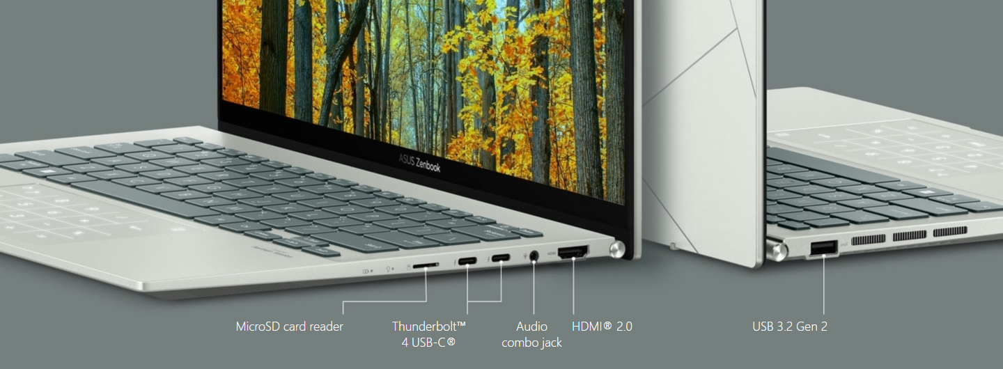 Zenbook 14 OLED is packed with all the I/O ports you need for easy connectivity to your devices and peripherals. The latest ultrafast Thunderbolt™ 4 USB-C® ports support fast charging, 4K UHD external displays and up to 40 Gbps9 data transfers, and there's also an HDMI® port and a USB 3.2 Gen 2 Type-A port alongside a microSD card reader. Communications and audio I/O are taken care of by the convenient audio combo jack.