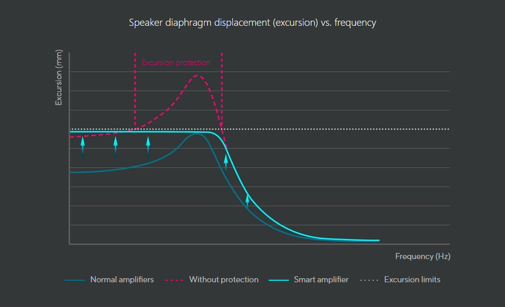 The smart amplifier's output is intelligently matched to the speaker's physical capabilities, fine-tuning the system across the entire spectrum to ensure distortion-free audio at any volume level. The result is a high-quality audio experience and reliable long-term operation.
