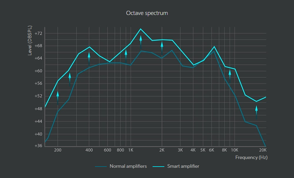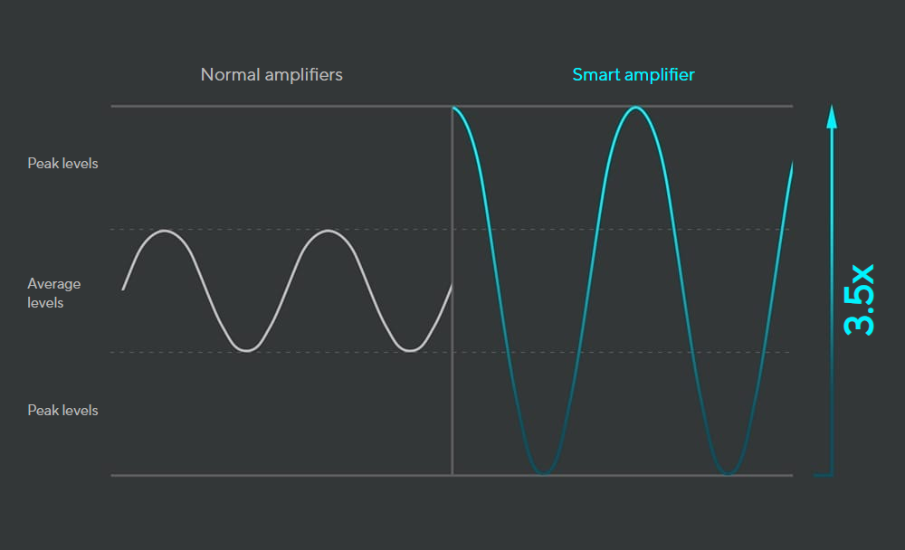 Our smart amplifier system uses a high-power amplifier that can increase speaker volume by up to 350%.