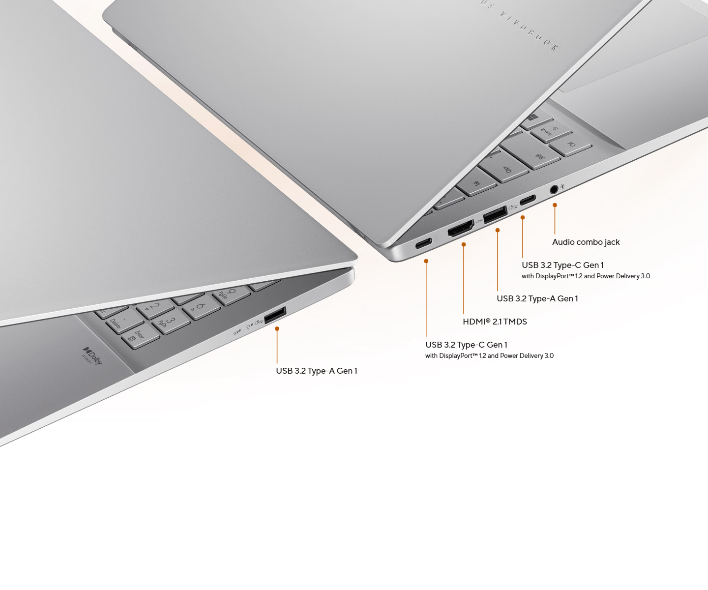 ASUS Vivobook S16 offers effortless connectivity, with all the essential ports you need. Say goodbye to annoying dongles and adapters - connect your devices seamlessly. It's designed for your on-the-go lifestyle.