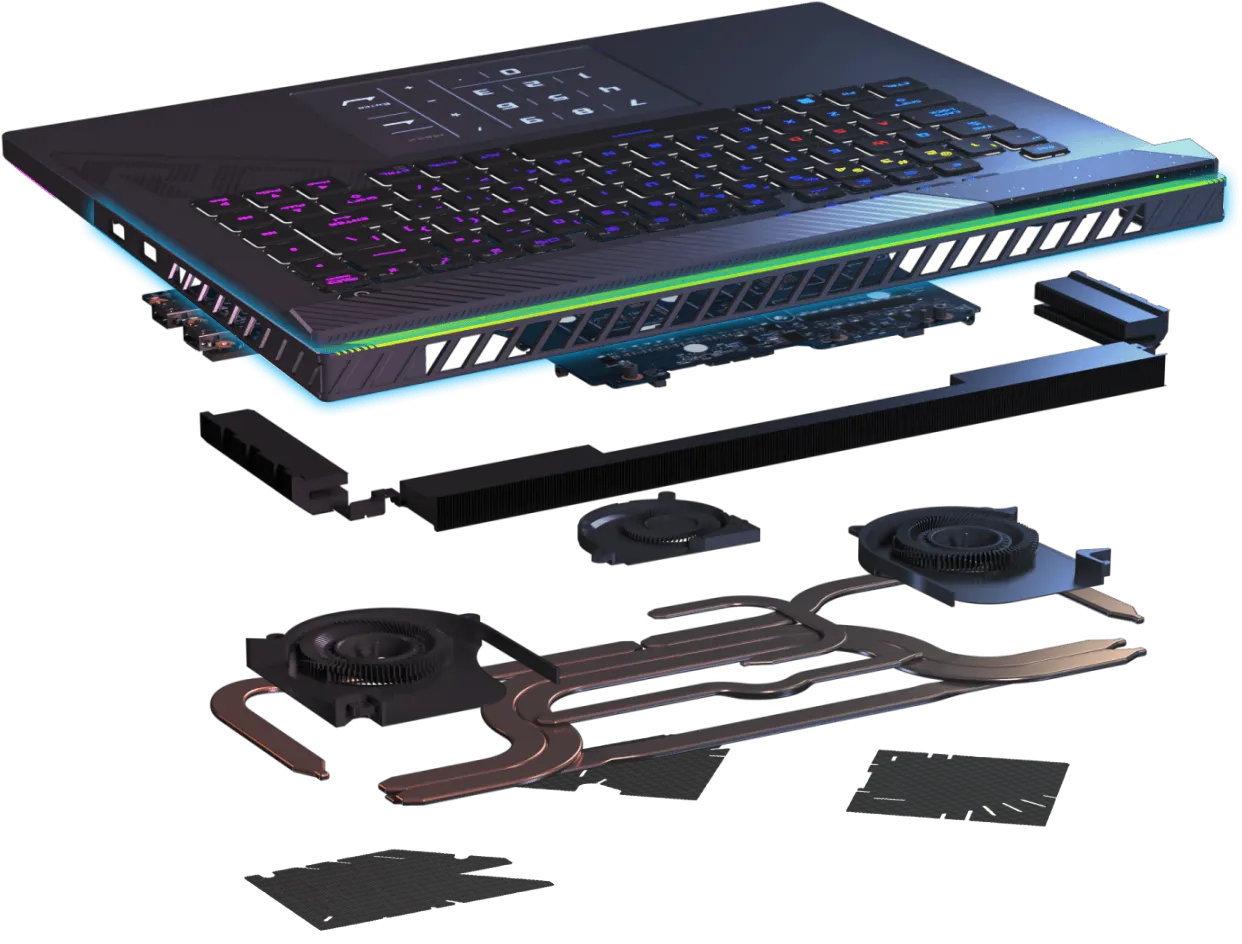 To accommodate such powerful components, the Strix G16's chassis and motherboard were both designed to accommodate our full-width heatsink, whose fins were moved even closer to the exhaust vents for more efficient cooling. The full-width heatsink is built from three different sections, surrounding the motherboard with densely-packed fins for a total surface area of 174,183mm²*. This design maximizes the available pathing for hot air to escape the machine and drastically increases overall airflow.