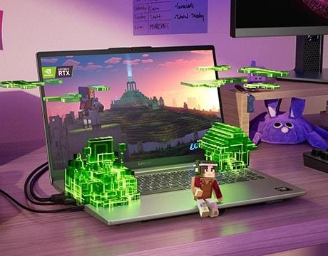 The Lenovo LOQ Essential 15ARP10 gaming laptop on a desk with a Minecraft Legends interface on the display and video effect control elements hovering in front of it.