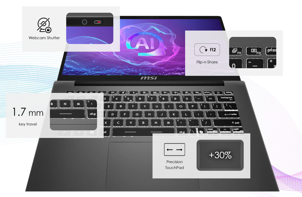 Modern Series is designed to cater to your diverse needs, across various scenarios on mobility. Now with an upgraded, larger touchpad, backlit keyboard with 1.7mm key travel, and 180° lay-flat Flip-n-Share function. You can also close the laptop's camera through the physical Webcam Shutter to ensure a safer and private experience.