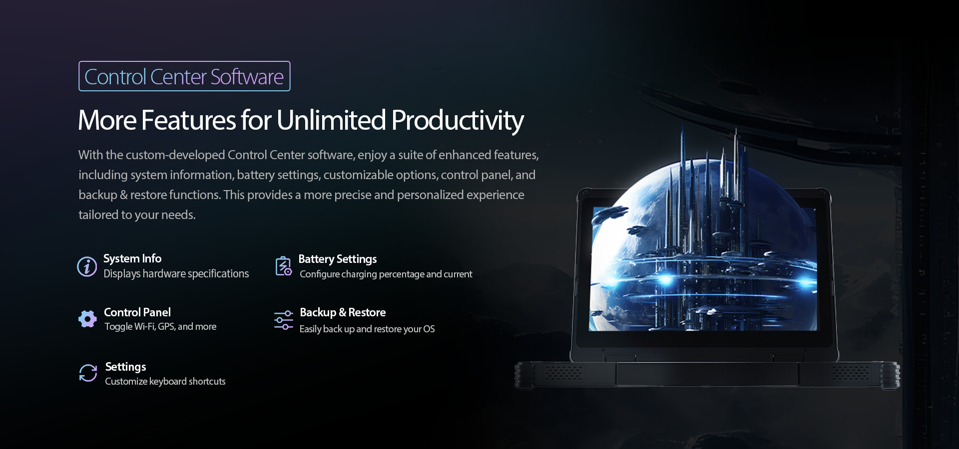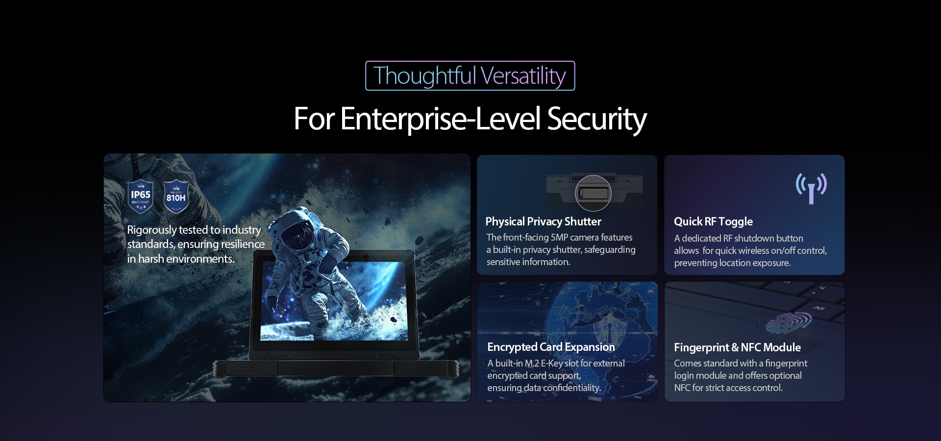 Equipped with the Intel® Core™ Ultra processor and Arc™ integrated graphics, this rugged AI PC delivers exceptional performance with a dedicated NPU for enhanced AI computing. The Windows 11 OS, combined with dual memory and storage slots, ensures smooth multitasking and expandable productivity. A 14-inch fully laminated display with optional glove touch is built for versatility, meeting IP65 and MIL-STD-810H standards for durability in tough conditions. The Thunderbolt 4 interface supports high-speed data transfers and seamless connectivity with multiple devices. Powered by a dual-battery system (56Wh + 14.4Wh), including a removable option, it offers extended operation for demanding tasks. Designed for global industries, this rugged AI PC is the ultimate tool for challenging environments.