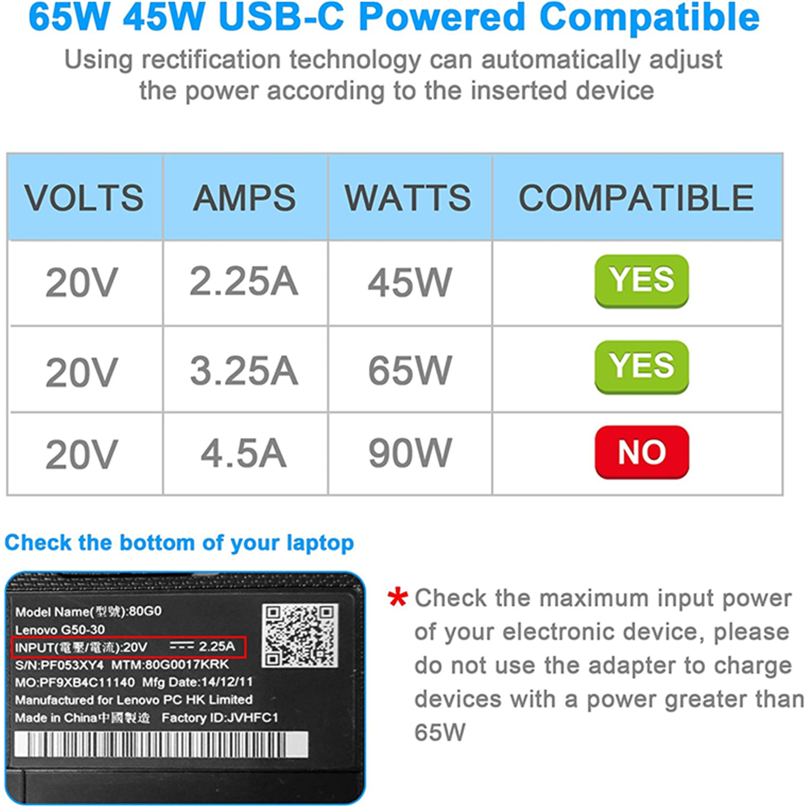 This charger has been tested to ensure compatibility with the following Lenovo 45W 65W USB-C laptops: