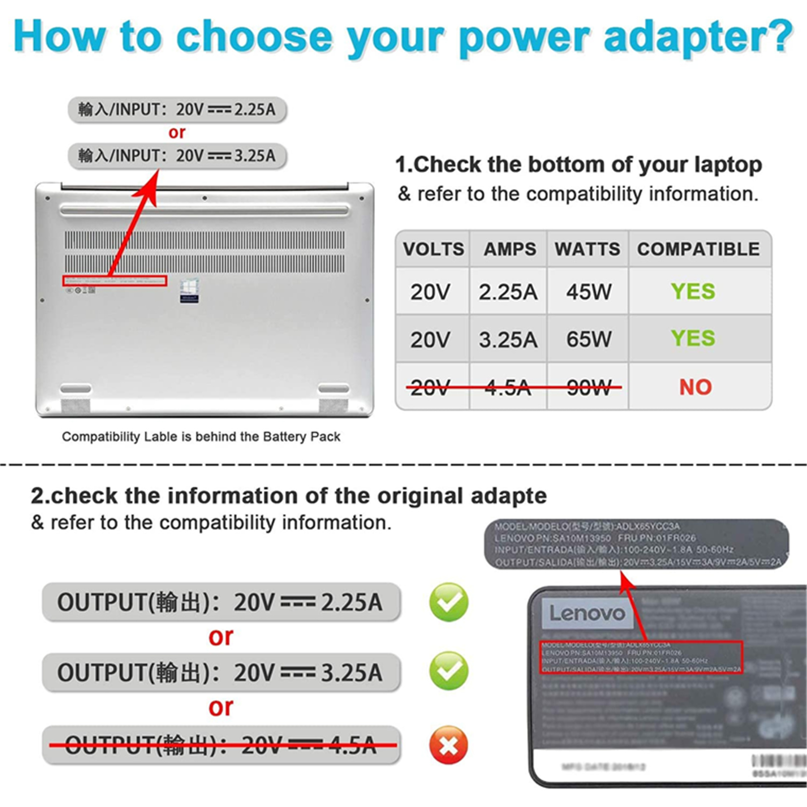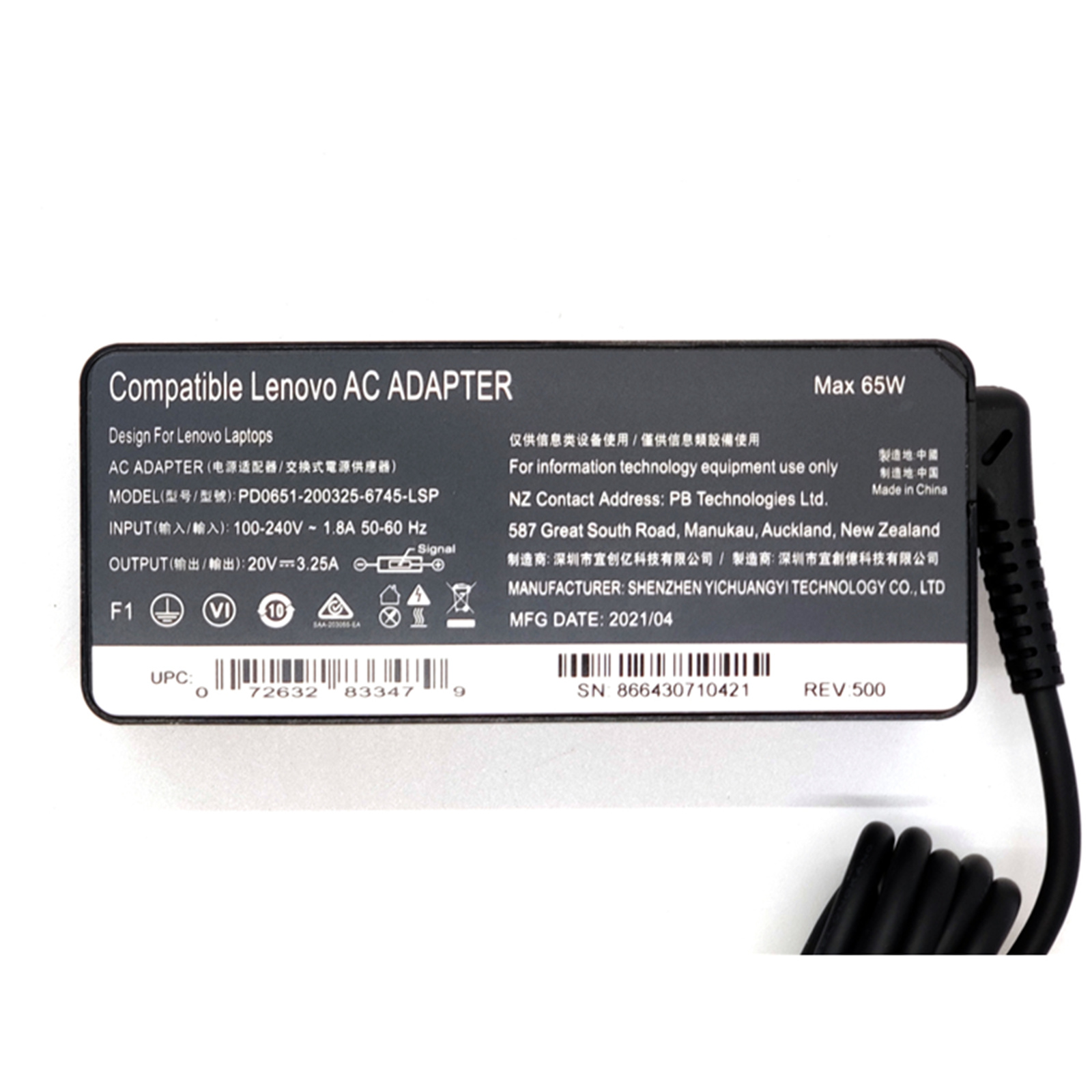PB Laptop Power Charger For Lenovo 65W 20V 3.25A - USB Slim Tip Square Connector - Power cord not included