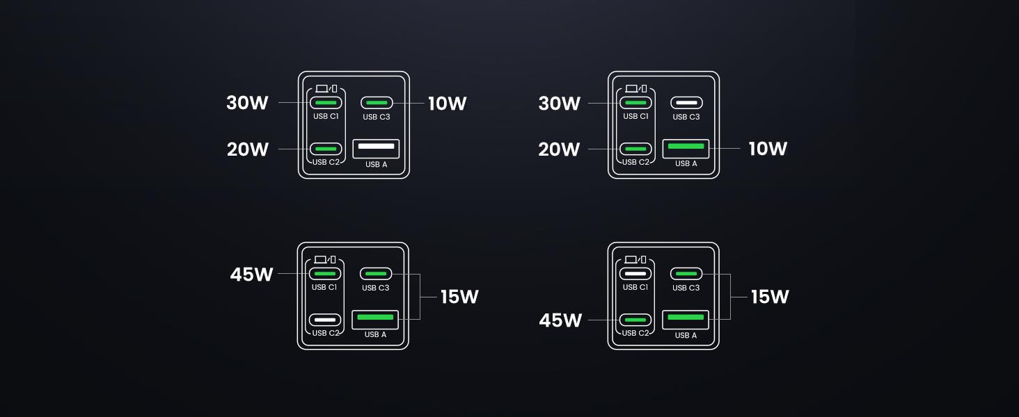 PD3.0, PD2.0, PPS, UFCS(63W), QC3.0/2.0, Apple5V/2.4A, BC1.2, AFC, FCP, SSCP, Galaxy Super Fast Charging 2.0 (USB-C1/C2 Port)