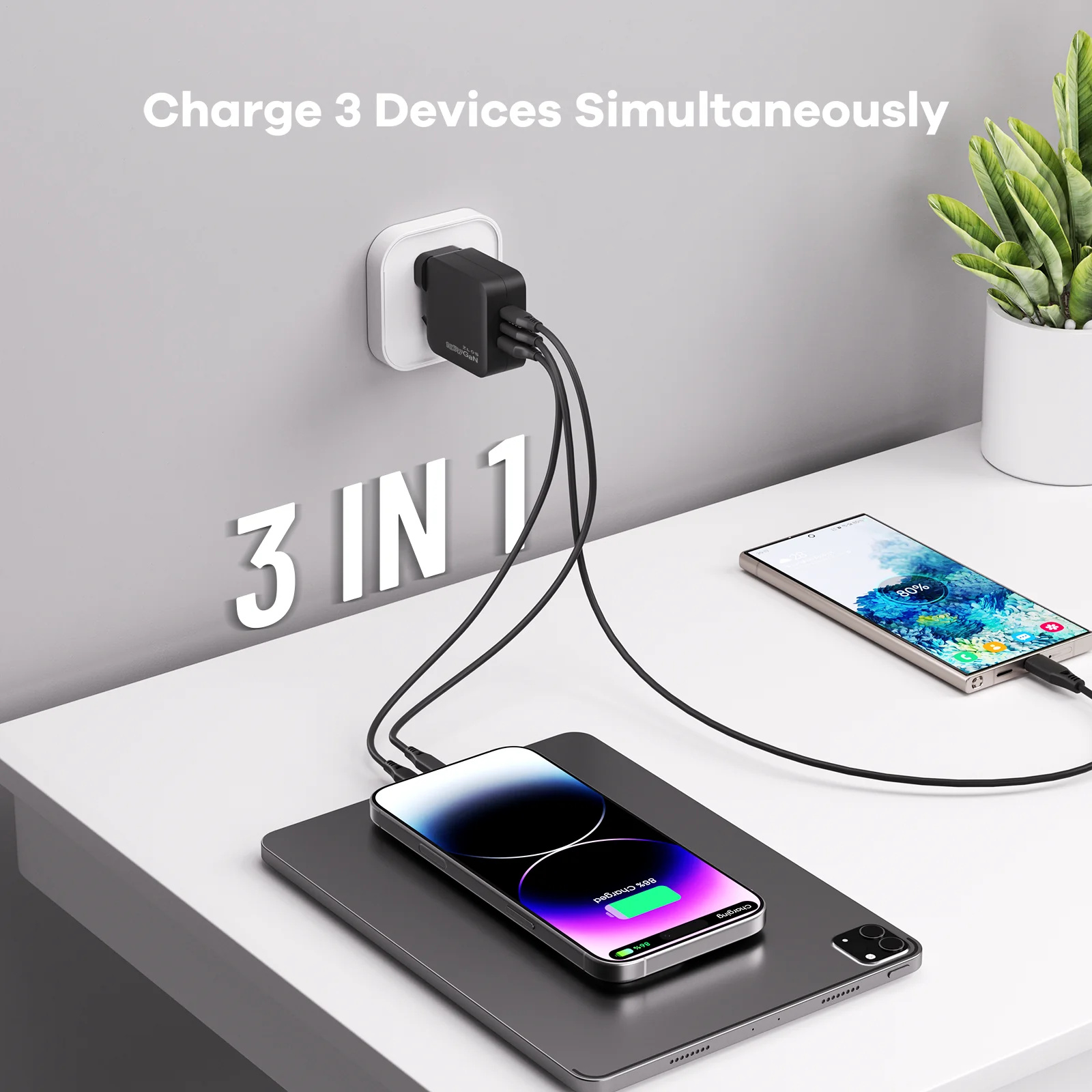 Introducing the ultimate charging solution! This charger allows you to charge 3 devices simultaneously. Simply plug it in, connect your gadgets, and watch as your phone, tablet, and more get powered up at the same time. No need to wait to charge one device after another-simplify your charging process and keep all your essential devices ready for use!