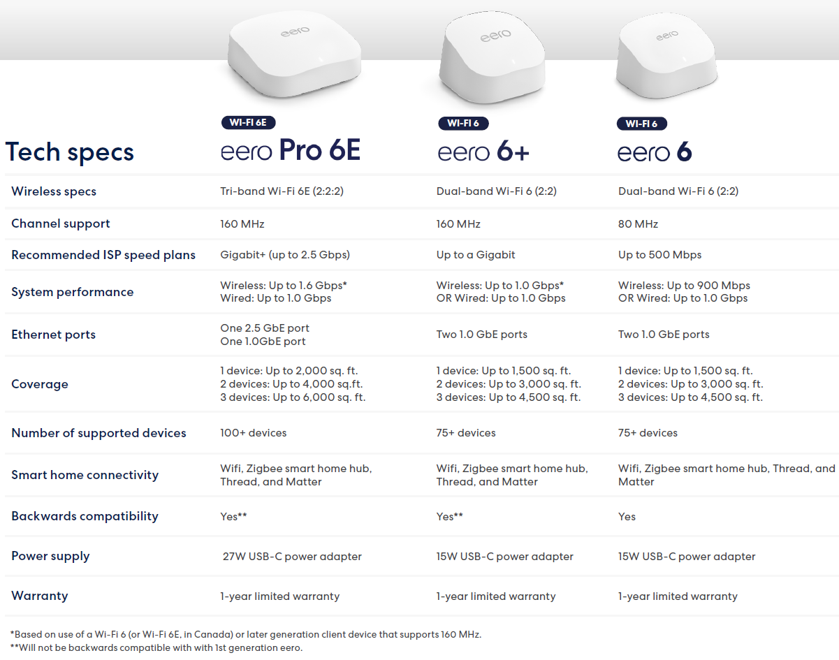 Some features require linking your Amazon account, and downloading the Alexa application or using a compatible Alexa device. Internet connection speeds and availability depend on the current internet speed you have with your ISP partner; if your ISP partner does not provide you with the maximum supported speed, you will not experience that maximum speed. Maximum network speeds, if applicable, reflect combined supported speeds across wired and wireless clients. Maximum wireless signal rates are derived from IEEE 802.11 standard. Specifications assume wired Ethernet connection; your experienced speed may vary when connected to an eero device that is configured as a wireless extender. Coverage estimates are based on normal use conditions. Actual range and performance can vary, and maximum supported speeds may not be available to all customers, due to factors such as local regulations (including power limits), network configuration, interference, connected devices, device usage, building materials, and obstructions. See https://eero.com/legal for more details regarding terms for eero products, software and services. For more information about eero performance, visit support.eero.com