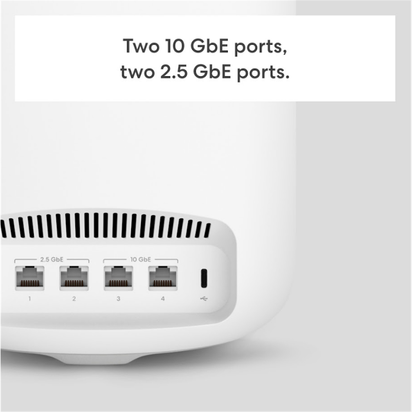 Support for internet plans up to 10 Gbps. Featuring two 10 GbE and two 2.5 GbE ports, enjoy wired speeds up to 9.4 Gbps and wireless speeds up to 4.3 Gbps with multi-gigabit backhaul for industry-leading network performance.