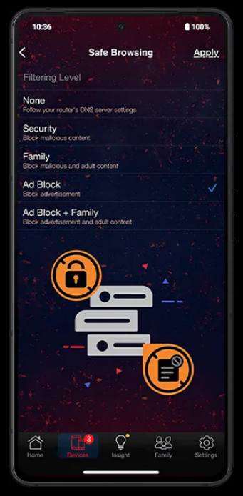 Content Filter delivers triple-level protection: Edge AI blocks ads and trackers, and enforces parental controls; AdGuard Home adds advanced local filtering; and AdGuard DNS extends protection across multiple sites via the cloud. Assign rules to keep your network safe, focused, and productive.