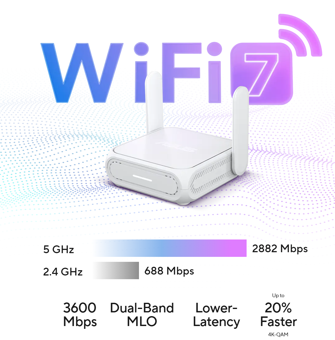 - Dual-band WiFi 7 speeds up to 3600 Mbps with MLO and 4K-QAM.