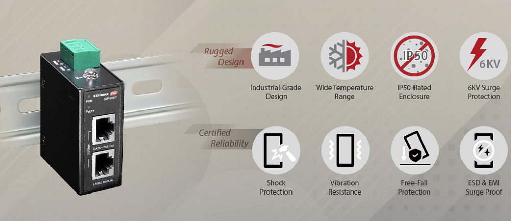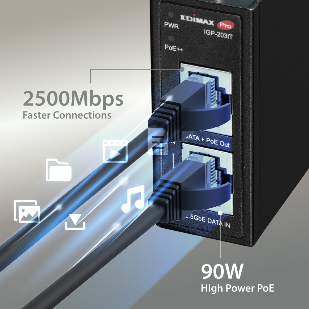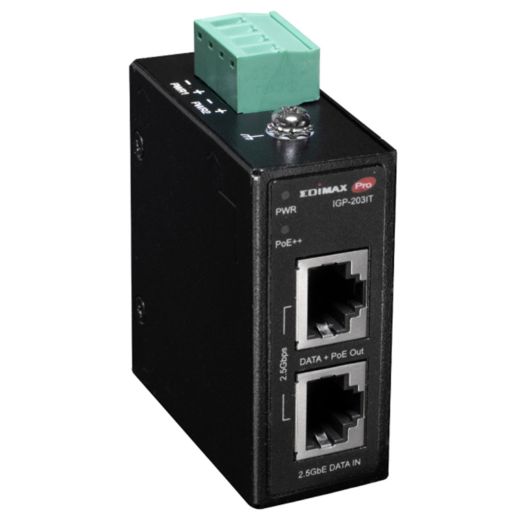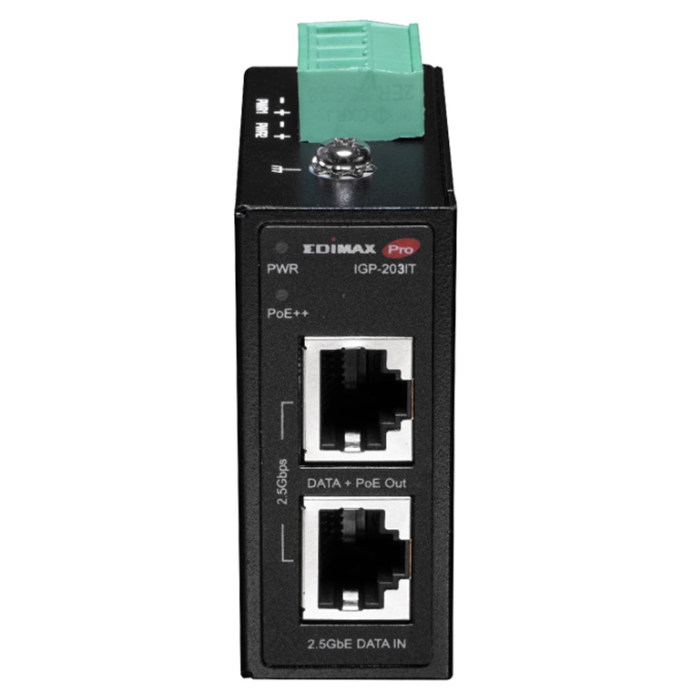 Edimax Industrial 2.5 Gigabit PoE++ 90W Power Injector. Supports IEEE 802.3at, IEEE 802.3at & IEEE 802.3bt, Provides Power & Data, DIN-rail or Wall-mount, IP50 Ingress Protection.
