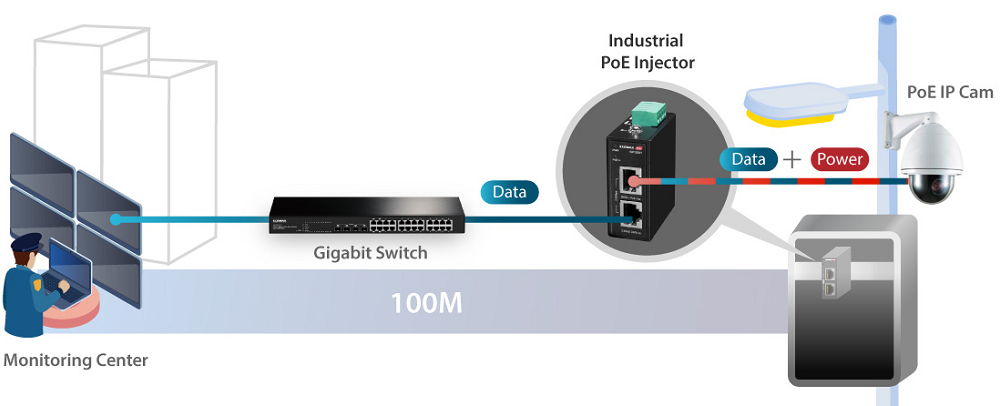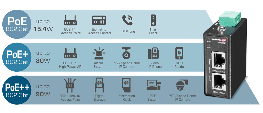 With the use of power injectors, DC power of up to 90W based on the IEEE 802.3bt standard and the data that comes from a non-PoE switch or router are merged together and then transmitted to the remote IEEE 802.3af/at/bt compliant products located without power outlet through the Ethernet cabling. Hence, the easy plug-and-play IGP-203IT 2.5 Gigabit PoE++ injector preserves your investment in hardware upgrade without the need to purchase extra PoE switches and deploy power cables.