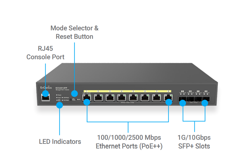 EnGenius Cloud ECS2512FP Multi-Gigabit 2.5 Gb Switch has 8-Ports, 2.5G per port, 802.3af/at/bt PoE++ Layer 2+ with 240W Budget, and 4 10G SFP+ uplink ports. Multi-Gigabit switches optimize network efficiency ensuring peak performance for large businesses. Select Cloud or on-premises management options based on network architecture, administrative permissions, technical aptitude, or budget.
