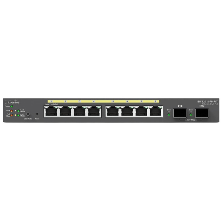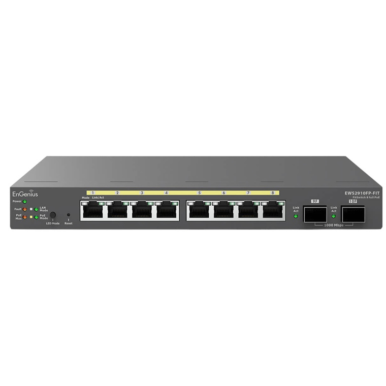 EnGenius Fit Layer 2+ Switch, EWS2910FP-FIT, offers 8 Gigabit PoE+ ports, 2 Gigabit SFP uplink ports, and a 110W budget. It provides zero-touch provisioning, centralized cloud management, and supports EnGenius FitXpress (cloud-managed), FitController (on-premises), or standalone management options. With advanced security features and Voice-VLAN, it maximizes network efficiency and reduces costs for SMBs.