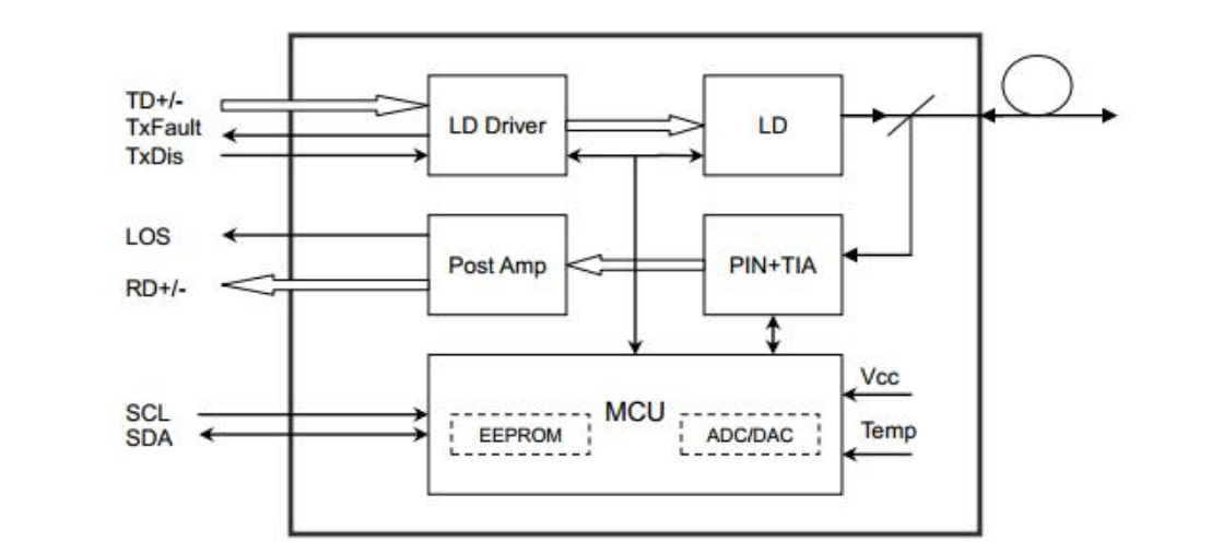 The transceiver consists of three sections: a DFB laser transmitter, a PIN photodiode integratedwithatrans-impedance preamplifier (TIA) and MCU control unit. All modules satisfy class I laser safety requirements.The transceivers are compatible with SFP Multi-Source Agreement (MSA) and SFF-8472.
