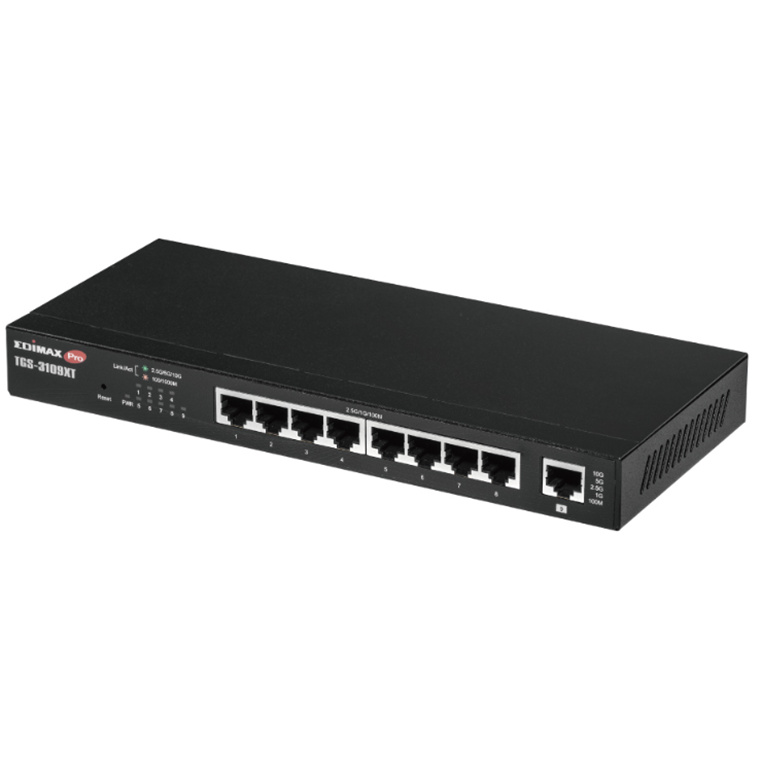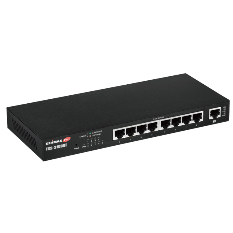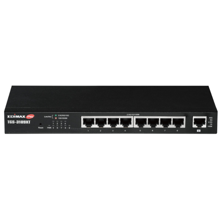 The EDIMAX Pro TGS-3109XT is a web-smart switch with 8x2.5GbE and 1x10GbE ports. The 10GbE port is a Multi-Gigabit 5-Speed that provides either 100Mbps, 1Gbps, 2.5Gbps, 5Gbps or 10Gbps. The switch offers powerful and reliable network connectivity, providing sufficient bandwidth and fast speed demanding applications such as data transferring, backup, video conferencing, IP surveillance, and Wi-Fi 6/6E/7 APs.