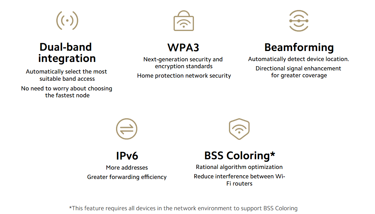 The 5G bands support a bandwidth as high as 160MHz, allowing for faster speeds than the Xiaomi Router AX1500 and Mi Router 4A Gigabit Edition*. Supports Wi-Fi 6 technology with dual-band concurrent wireless speeds up to 2976Mbps* delivering lower latency and faster speeds, perfect for streaming 4K movies and playing high-definition online games.