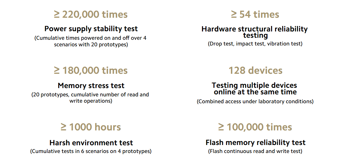 *The data for the power supply stability test, hardware structural reliability test, memory stress test, multiple device simultaneous connection test, harsh environment test, and flash memory reliability test are from the Xiaomi Internal Lab Routing Reliability Test Report
