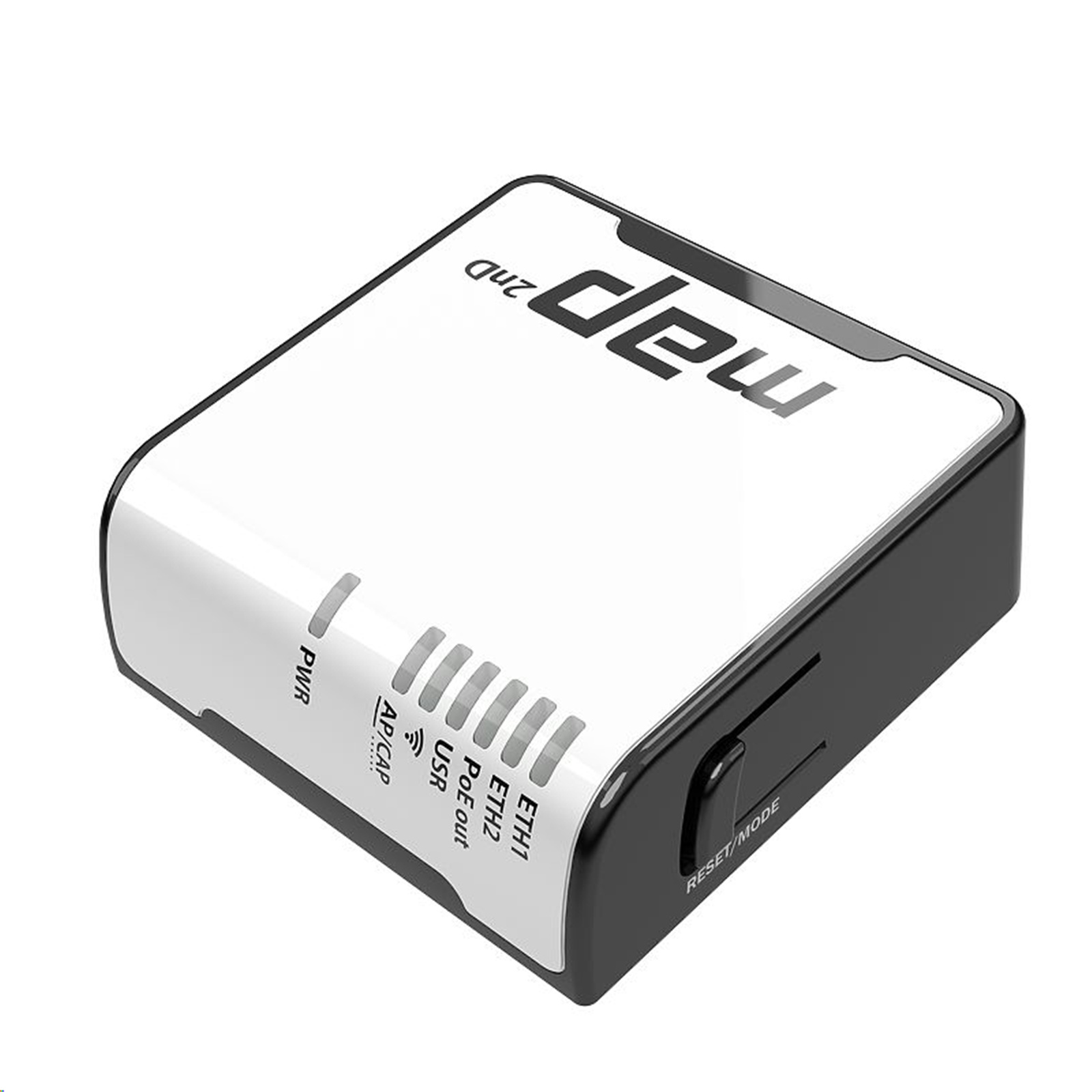 The mAP (micro Access Point) is a tiny size wireless Dual-Chain 2.4GHz Access Point with full RouterOS capabilities. It is very portable, since it accepts power from a wide variety of sources - USB, Passive PoE and power jack. It also works as a PoE injector - the second Ethernet port provides up to 500mA of power to another device, for example, you can connect a SXT CPE device to it.